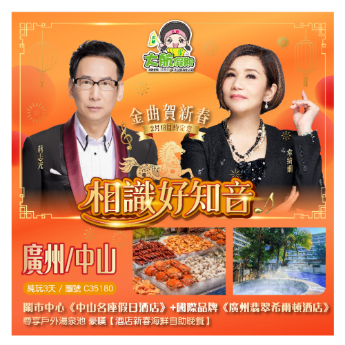【2.18年初二晚會】蔣志光&韋綺姍<相識好知音 金曲賀新春> 打卡一年一度迎春花燈 尋味經典【年年有餘脆肉鯇美食宴】【龍馬精神果木燒鵝宴】保證入住五星級《中山名座假日酒店》純玩2天