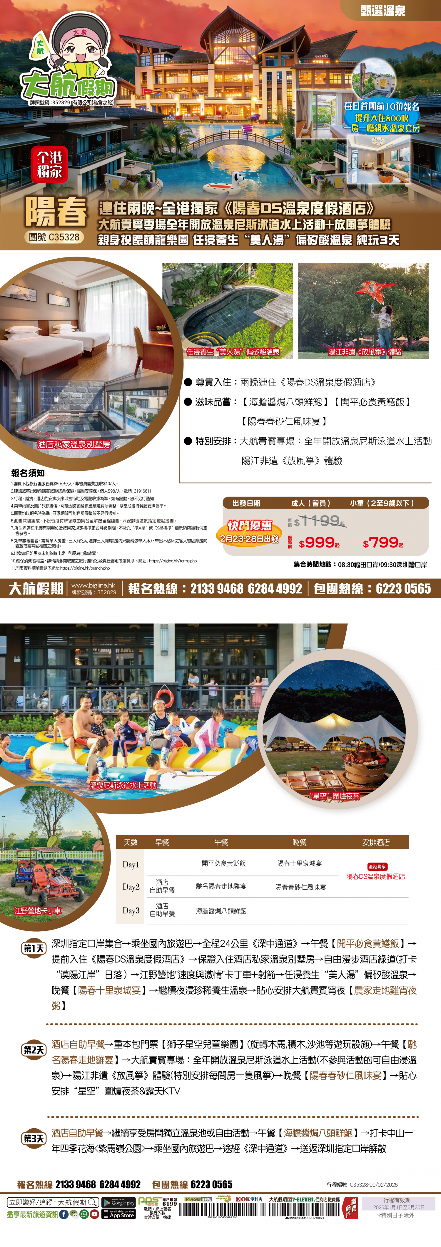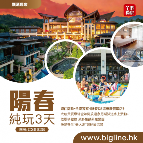 【甄選溫泉】連住兩晚~全港獨家《陽春DS溫泉度假酒店》大航貴賓專場全年開放溫泉尼斯泳道水上活動+放風箏體驗 親身投餵萌寵樂園 任浸養生“美人湯”偏矽酸溫泉 純玩3天