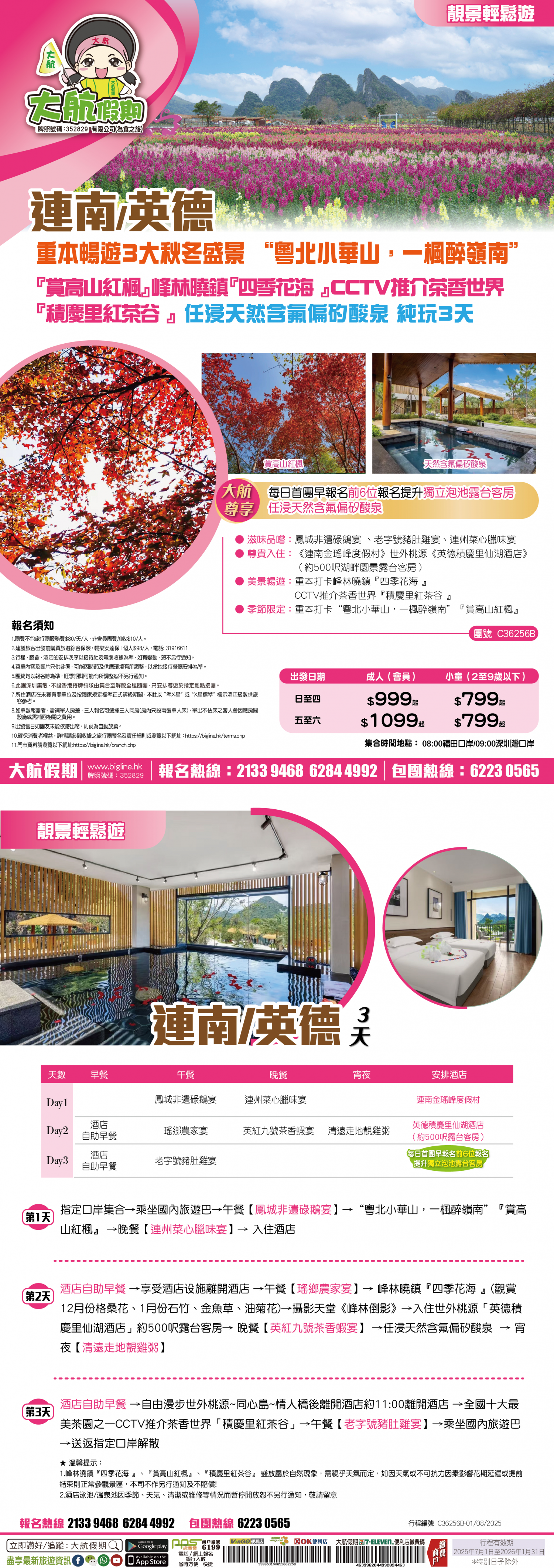 【季節限定 深秋美景】重本暢遊3大秋冬盛景 “粵北小華山,一楓醉嶺南”『賞高山紅楓』峰林曉鎮『四季花海 』CCTV推介茶香世界『積慶里紅茶谷 』 任浸天然含氟偏矽酸泉 純玩3天