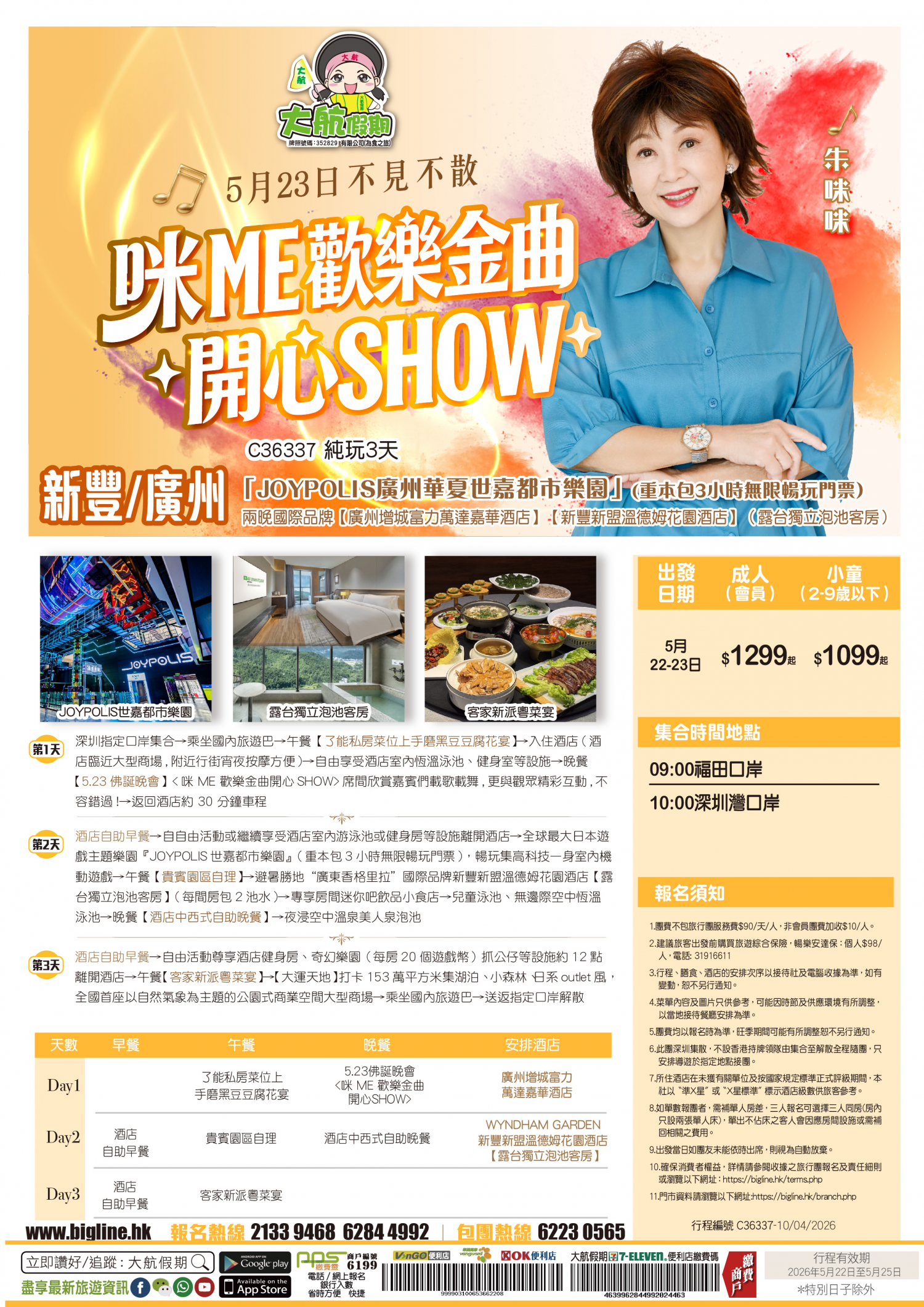 | 第1天 | 私房菜位上手磨黑豆豆腐花宴 | 【5.23佛誕晚會】<咪 ME 歡樂金曲開心SHOW> | 廣州增城富力萬達嘉華酒店 | |