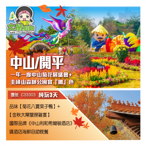 【季節限定】一年一度中山菊花展盛會+圭峰山森林公園賞『楓』色 品味【菊花八寶果子鴨】+【金秋大閘蟹撈雞宴】國際品牌《中山利和希爾頓酒店》嘆酒店海鮮自助晚餐 純玩3天