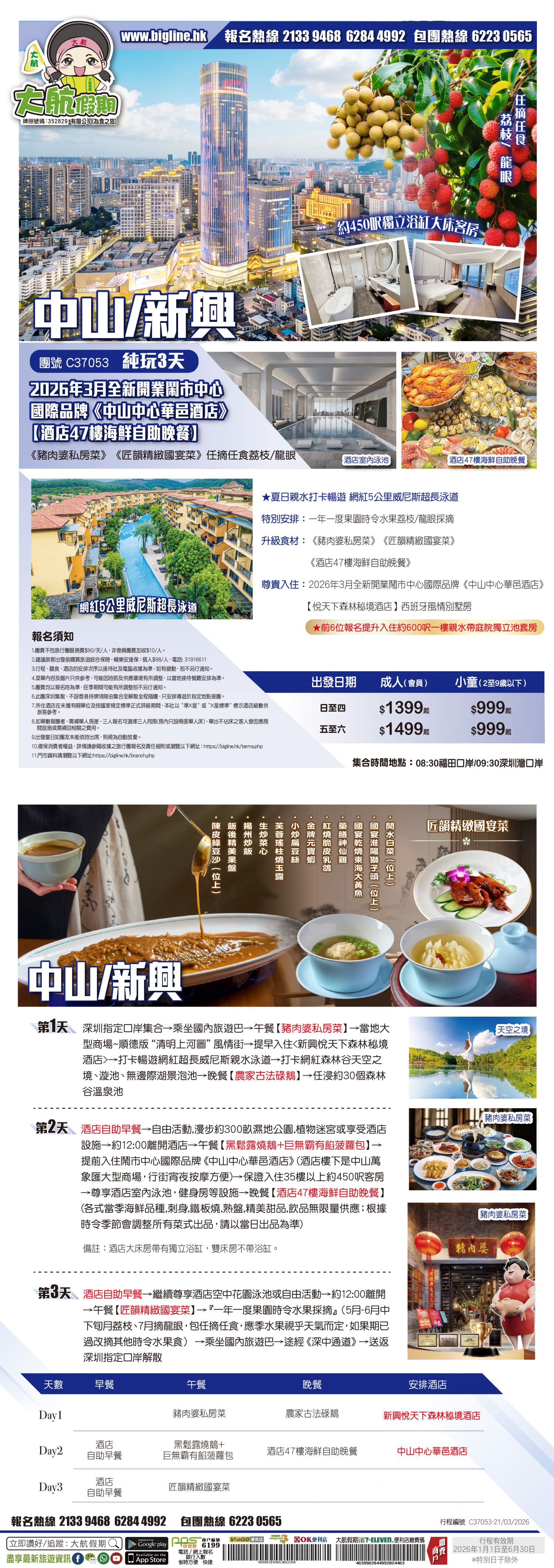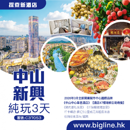 【探索新酒店】2026年3月全新開業鬧市中心國際品牌《中山中心華邑酒店》保證入住35樓以上約450呎客房 豪嘆【酒店47樓海鮮自助晚餐】皇牌推介<位上冰鎮菊花(六頭)鮑魚><鴻運荔枝柴鳳凰宴>純玩2天