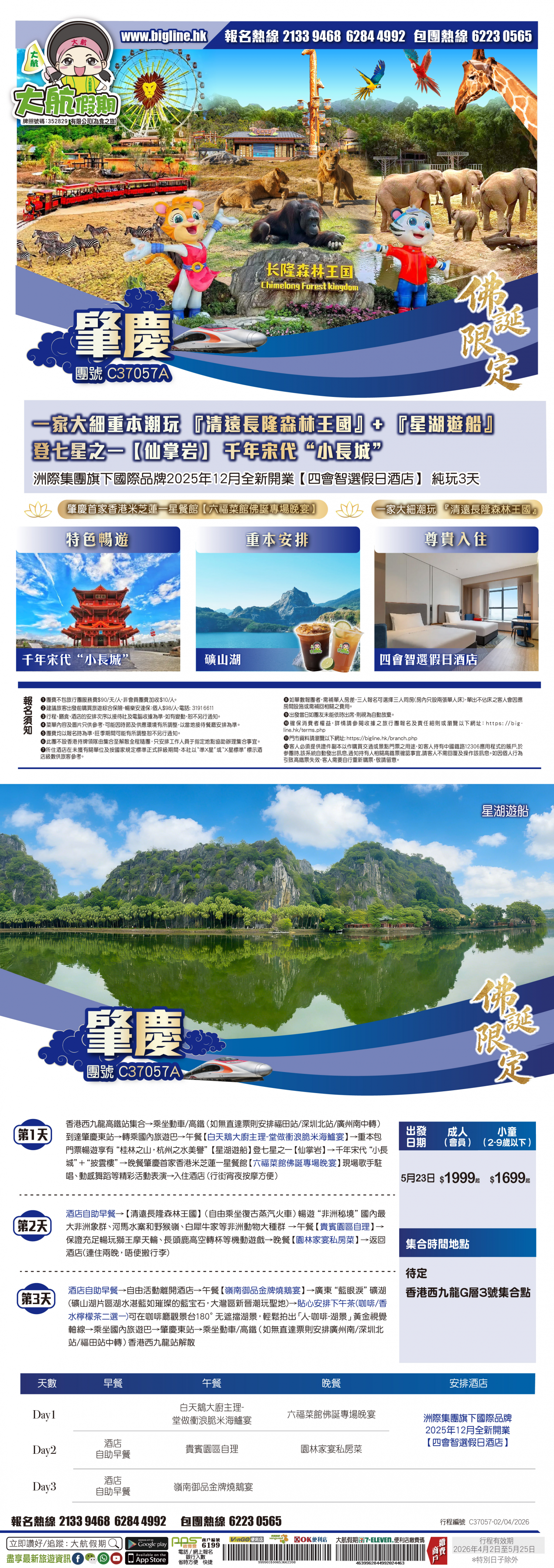 | 第1天 | 【白天鵝大廚主理-堂做衝浪脆米海鱸宴】 | 肇慶首家香港米芝蓮一星餐館【六福菜館佛誕專場晚宴】現場歌手駐唱、動感舞蹈等精彩活動表演) | 四會智選假日酒店 | |