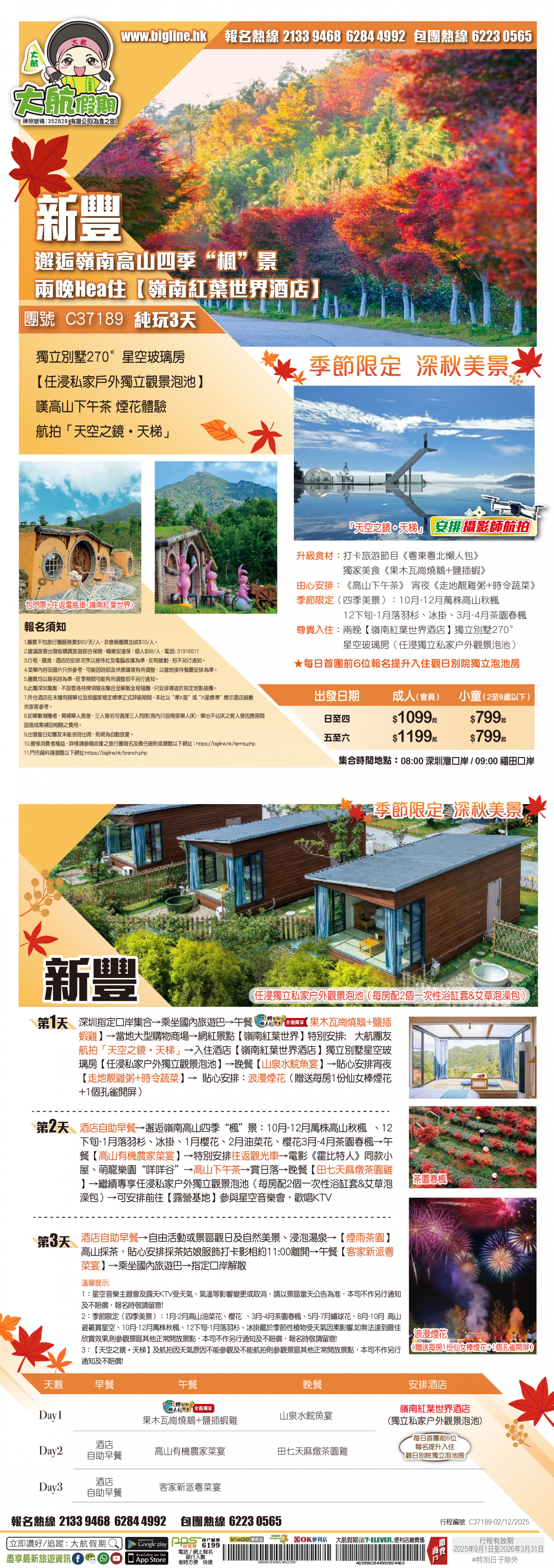 *團員繳付退票費後 (如適用): 1) 已繳款項可保留半年; 或 2) 選擇轉團後, 餘款則保留半年; 或 3) 可繳付『迫不得已理由』之手續費後, 取回已付餘款。 *個別機票+酒店套票產品如因『迫不得已理由』取消外遊行程, 處理旅客退款時亦按以上訂列收取每位退票費及手續費, 並以行程表 (套票單張) 所列為準。 責任細則: 1. 本公司保留合併團隊出發的權利。 2. 行程書或單張內所列費用根據當時機票價格及國際貨幣兌換率而訂立。外幣浮動等情況之下, 本公司保留在出發前調整各項費用的權利及徵收額外費用。 3. 所有列出的交通服務資料只供參考, 如有更改概不負責, 一切須以出票時為準。 4. 除本公司直接提供之服務外, 本公司及其職員或附屬公司或與本公司有經營關係之公司代理人身份在香港或外地安排其他獨立機構所提供之交通工具 (如飛機、輪船、火車、或遊覽巴士等) 、住宿、膳食或娛樂觀光項目等 (“委託機構”), 團員如遇交通延誤、行李遺失、意外傷亡或財物損失等, 該依照當地法律向擁有、管理或操作之委託機構直接交涉或追討賠償, 通常該等機構均各訂位不同條例, 以對客人負責。在此情況下, 本公司概不對該等損失或傷亡負責。 5. 除因由本公司之員工或其他直接管理或操作之機構之疏忽而引致團員之個人傷亡外, 本公司對團員在任何意外中之個人傷亡、經濟、娛樂或精神損失概不負責。 6. 除經本公司同意及安排, 如團員自行更改由其他人士代為參團, 本公司或其委託機構之職員有權取消其隨團之資格, 而無須發還任何團費, 而該人士在隨團期間之保險、責任賠償、行為後果等均由該人仕自行承擔。 7. 如因天氣、罷工、戰爭、怠工或安全情況影響而引致有關交通工具暫停服務, 停航或其他事故, 而必須將行程更改或取消部份行程, 本公司則將團員所繳交之費用扣除因以上事故而引致之損失後, 退回差額給團員。 8. 有關住宿、膳食、遊覽節目等問題, 均依據行程表安排, 行程先後次序有可能需要更改, 一切以當地安排為準。若遇特殊情況, 如簽證受阻, 當地酒店突告客滿或航機改變飛行時間或地點, 以及非本公司或其委託機構所能控制之因素, 令旅行團節目有增減, 或臨時更改交通工具、班機時間、機種及更換酒店等等, 本公司或其委託機構得依當時情況全權盡力處理, 團員不得藉故反對或退出, 因故取消之節目, 將不獲退還款項, 任何因延期而引致之額外支出, 本公司或其委託機構概不負責。 9. 所有酒店及住宿根據行程安排, 本公司視乎當時情形作出更改, 但不限於遇展覽會或特殊情況下, 將住宿鄰近城市之同等級酒店及住宿代替。本公司如因『迫不得已理由(外遊)』(即指戰爭、政治動盪、恐怖襲擊、天災、疫症、惡劣天氣、交通工具發生技術問題、載運機構臨時更改班次或取消服務、罷工、工業行動、旅遊目的地政府或世界衛生組織發出旅遊警示(警告)、香港特別行政區政府發出紅色或黑色外遊警示、不可抗力事件,以及業界不能控制的其他不利離開香港或在香港境外旅遊的情況)於外遊旅行團出發後更改任何項目而引致成本增加,可向顧客徵收額外費用。 10. 【已成團】代表該團號之指定出發日期預訂機位或已有足夠人數報名參加。但出發與否還受其他因素影響, 本公司保留最終決定權。 11. 任何團員在參與各項活動時, 如經常不遵守服飾人員之指引或安排, 在行動或言語上侮辱或滋擾其他團員或工作人員, 本公司或其委託機構職員有權視具體情況而取消其隨團資格而母須發任何團費, 而受該旅客監護之18歲以下同行團員亦須一併離開, 有關旅客離團後一切活動, 概與本公司或其委託機構無關。 12. 團員如欲於旅程完畢後延期返港, 須於出發前十四天提出, 以便本公司代為預定返港機位, 延期返港之機位, 未能即時作實, 團員不得藉此理由要求退出, 旅程完畢後延期逗留之費用, 概由團員自負。 13. 延期返港之團友, 必須在離境前七十二小時向航空公司確實回程機位, 任何機位如有變更, 概與本公司無關。 14. 團員如在旅途中自行離團或放棄行程, 離團後之責任自負, 一切後果與本公司或其委託機構無關。 15. 參團者須切實遵守各國及各地法例, 包括但不限於防疫防控條例, 並嚴禁攜帶違例物品出入境, 並照實申報攜帶之物品及現金。 16. 任何種類的簽證審批權及出入境批准權一律由該國或地區之領事館及/或出入境部門全權決定, 出入境如有問題, 責任旅客自負, 本公司或其委託機構母須負任何責任。如簽證已代辦, 簽證費恕不退還。 17. 即使團員持有效之入境簽證及旅遊證件, 而於入境時被當值之移民局海關人員拒絕入境, 本公司或其委託機構亦無須負任何責任。所需額外安排之食宿、交通費用、全部由其本人負責, 其餘下的行程亦將不會獲得任何補償, 亦不得要求退款或改團。 18. 中國內地相關法規規定, 即日起旅客入住中國內地境內酒店時, 公安機關會透過酒店前台向旅客一併採集人像信息資訊。 19. 如出現一些非本公司能力範圍可控制之問題 (如花卉、紅葉提早凋謝或景觀、自然現象、景點活動或戶外項目) 會受天氣等因素影響, 如未能安排則取消不作任何退款安排。 20. 旅客如在旅程中確診 COVID-19或其他傳染病,無論受到當地政府隔離或其他檢疫要求影響與否,為確保其他旅客之安全,確診旅