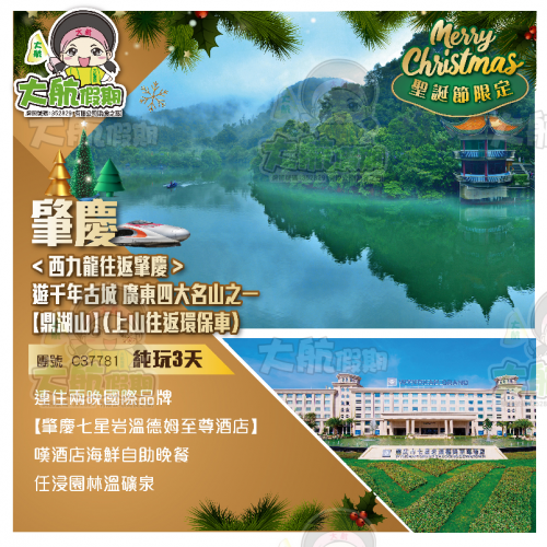 【聖誕節限定】< 西九龍往返肇慶 > 特別安排廣東四大名山之一【鼎湖山】(上山往返環保車)連住兩晚國際品牌【肇慶七星岩溫德姆至尊酒店】嘆酒店海鮮自助晚餐 任浸園林溫礦泉 純玩3天