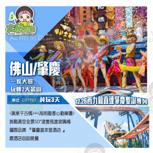 【聖誕節限定】< 12.26西九龍直達肇慶聖誕專列> 一家大細玩轉2大景區<廣東千古情>+<高明盈香心動樂園>挑戰高空全景5D"淩雲飛渡玻璃橋 國際品牌 『肇慶喜來登酒店 』嘆酒店自助晚餐純玩3天