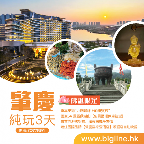 【星級酒店】遊國寶級古廟【德慶悅城龍母古廟】感受千年龍母文化 包酬神金豬一隻、龍母五寶祈福 國際品牌【肇慶喜來登酒店】約500呎露台湖景房 嘆酒店海鮮自助晚餐純玩2天