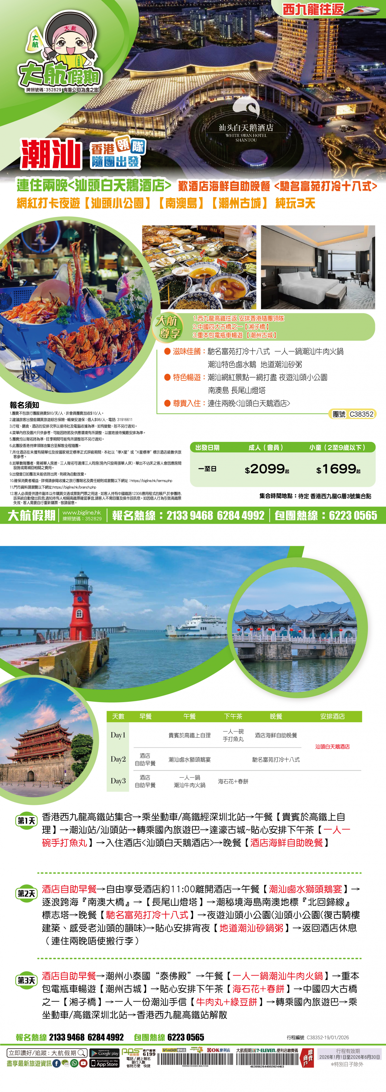 | 第2天 | 酒店自助早餐 | 澄海滷水獅頭鵝宴+1人1隻大鵝翼 | 馳名富苑潮汕打冷十八式 | 汕頭白天鵝酒店 |
