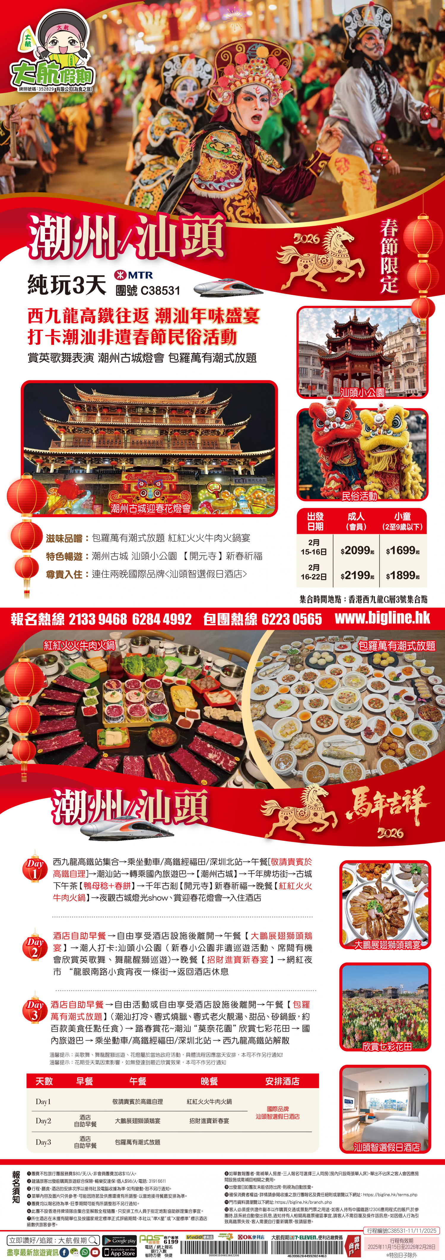 | 第2天 | 酒店自助早餐 | 大鵬展翅獅頭鵝宴 | 招財進寶新春宴 | 汕頭智選假日酒店 |