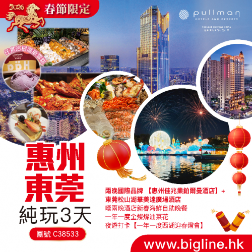 【春節限定】兩晚國際品牌 【惠州佳兆業鉑爾曼酒店】+【東莞松山湖華美達廣場酒店】 嘆兩晚酒店新春海鮮自助晚餐 一年一度金燦燦油菜花 夜遊打卡【一年一度西湖迎春燈會】純玩3天