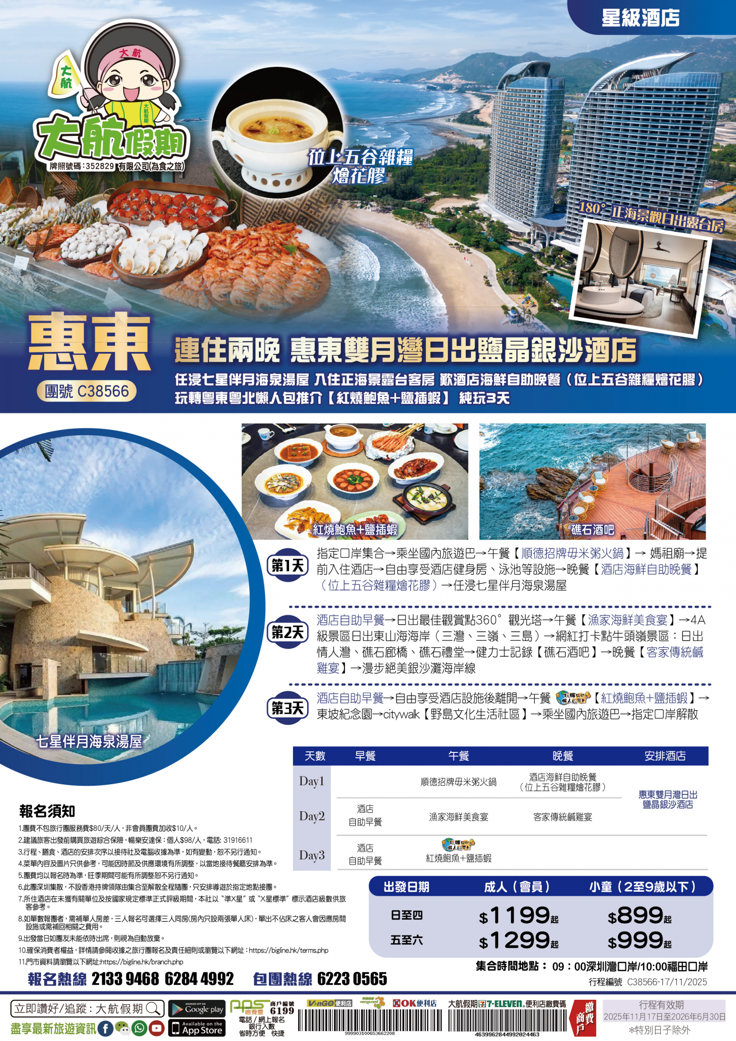 | 第1天 | 順德毋米粥火鍋宴 | 酒店自助晚餐 | 雙月灣日出銀沙鹽晶酒店 | |
