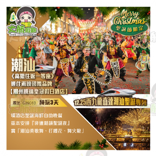 <12.25西九龍直達潮汕聖誕專列>《高鐵往返一等座》連住兩晚國際品牌【潮州騰瑞皇冠假日酒店】嘆酒店聖誕海鮮自助晚餐 重本安排『非遺潮韻聖誕夜』賞「潮汕英歌舞、打鐵花、舞火龍」高鐵純玩3天