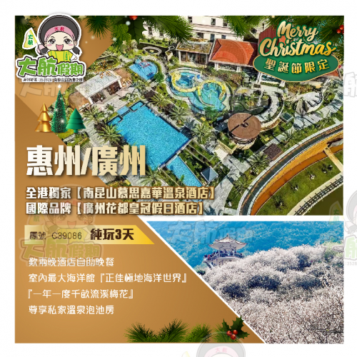 【聖誕節限定】全港獨家【南昆山慕思嘉華溫泉酒店】+ 鬧市中心·國際品牌【廣州花都皇冠假日酒店】歎兩晚酒店自助晚餐 室內最大海洋館『正佳極地海洋世界』『一年一度千畝流溪梅花』尊享私家溫泉泡池房 純玩3天