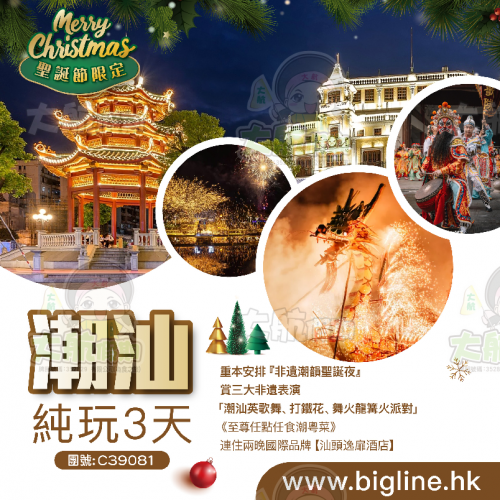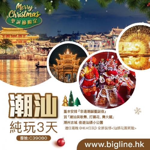 <12.25西九龍直達潮汕聖誕專列>重本安排『非遺潮韻聖誕夜』賞「潮汕英歌舞、打鐵花、舞火龍」潮州古城 夜遊汕頭小公園 特別安排南澳島航拍 連住兩晚2024年8月全新裝修【汕頭花園賓館】純玩3天
