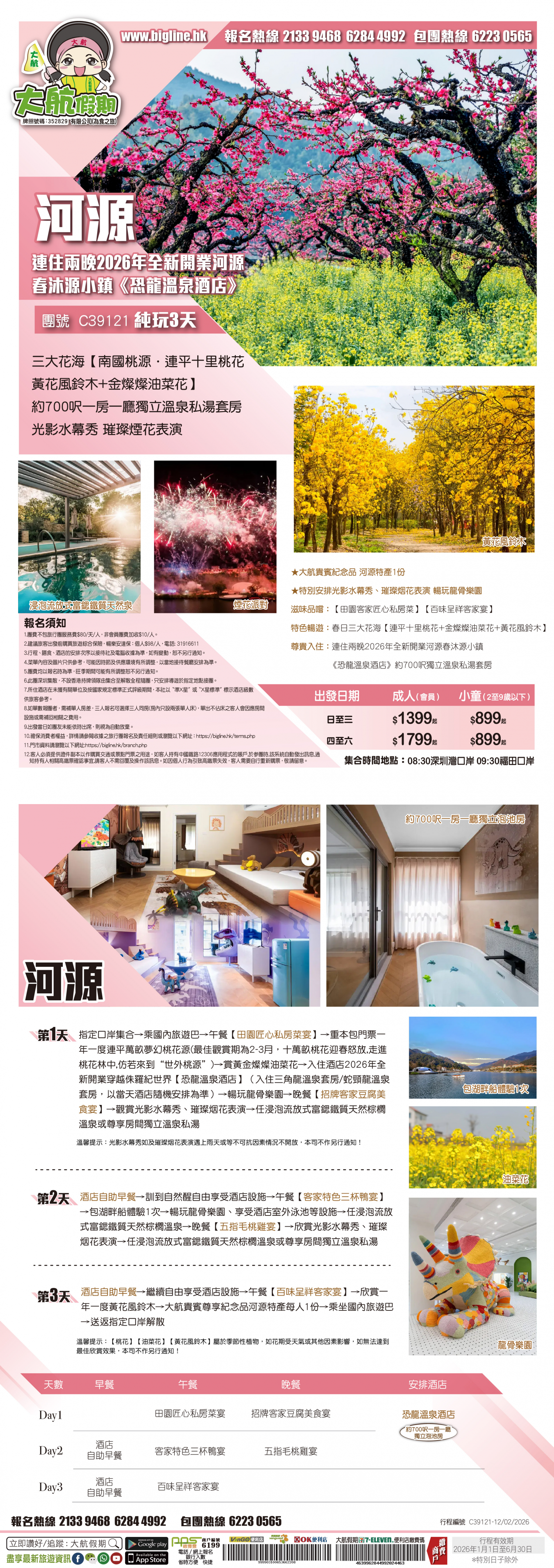 【探索新酒店】三大花海【南國桃源·連平十里桃花+黃花風鈴木+金燦燦油菜花】連住兩晚2026年全新開業河源春沐源小鎮《恐龍溫泉酒店》約700呎一房一廳獨立溫泉私湯套房 光影水幕秀煙花表演龍骨乐园纯玩3天