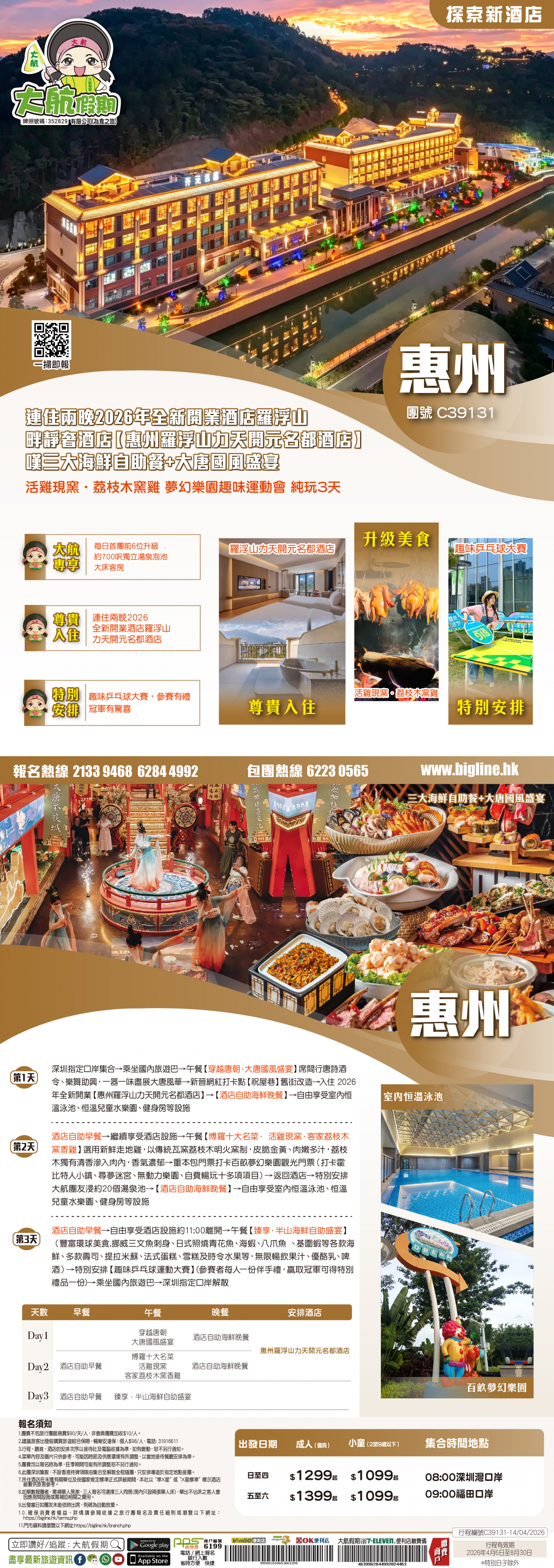 | 第1天 | 大唐國風盛宴 | 酒店自助晚餐 | 惠州羅浮山力天開元名都酒店 | |