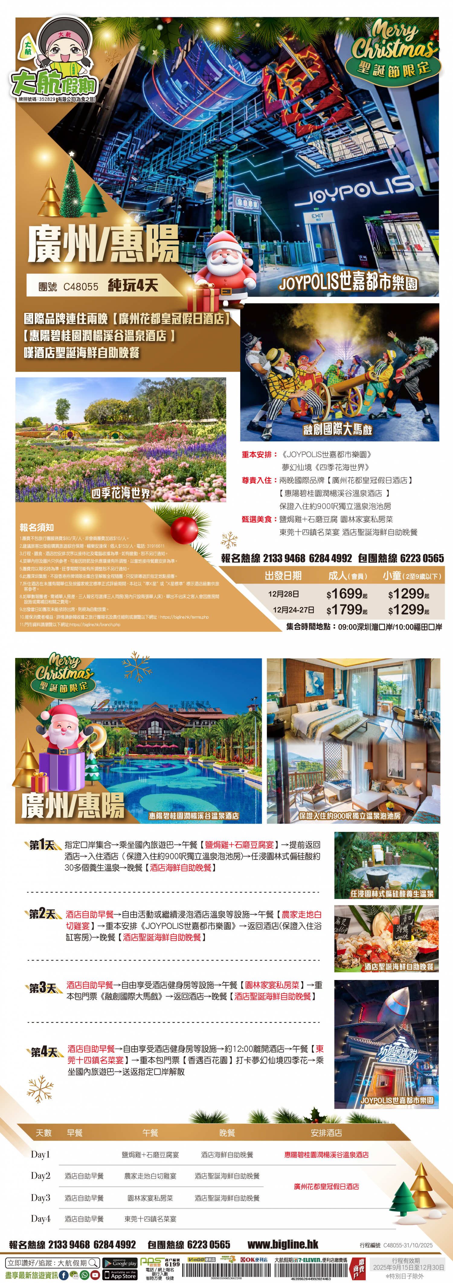 6. 團費及其他相關費用包括但不限於:稅項、機場保安費、旅行團服務費、郵輪服務費、旅遊保險的保費、有關簽證及其相關費用(包括但不限於簽證費及代辦簽證的服務費/手續費)須在出發前21天繳清, 長線則為30天前 (旺季期間須在出發前30天繳付, 長線則為 45天前), 個別線路亦將因應不同供應商之經營條件而作出調整,以該團的單張資料為準; 逾期未清繳費用者, 本公司得將訂位作廢, 所繳訂金例不發還, 亦不得將訂金轉予他人或轉用於其他日子出發及其他旅行團。 7. 付款方式以各訂購渠道之系統可接受為準。 8. 所有一切代收之款項,包括但不限於燃油附加費、香港及各地機場稅和機場建設稅等, 本公司只接受以現金或易辦事繳付所有代收費用。 - 信用卡/分期付款計劃或銀聯卡付款, 以銀行確認成功過賬, 方可作實。 - 請保留收據, 以作退款之憑據, 如以信用卡免息分期或銀聯卡付款, 則退款必須經由銀行辦理手續, 退回該信用卡/銀行戶口, 需時最少約三十五個工作天, 退款時間及一切有關條款均由信用卡公司決定。 9. 鑑於外幣浮動、因燃油附加費的浮動以致機票成本增加、或因事前未能預見的情況(包括但不限於交通票、酒店、保險等方面)導致成本上升, 本公司保留權利在顧客繳付全部團費及其他相關費用前向有關顧客徵收額外費用。價格如有更改, 將會另行通知。燃油附加費價格以航空公司最後公佈為準。一切費用必須於出發前全數繳付。受影響的顧客在無損其法律權利和責任的原則下,可選擇支付該額外費用以繼續參加該旅行團,或於該旅行團出發前選擇退出。如屬後者,本公司將於發出徵收額外費用通知後的七個工作日內(發出通知當日不計)或於顧客選擇退出該旅行團後的七個工作日內(顧客退出當日不計)(以較後發生者為準)退還或(如顧客以信用卡繳付款項)安排退還顧客所付的款項。 10. 減免折扣優惠, 必須於報名時申請及提供證明予本公司, 概不補發。 11. 當地參團之團費不設任何優惠。團員亦須自備國際機票、所有內陸機票及個別路線之部份交通安排。 12. 本公司收費上的年齡定義 : 0至23 個月為嬰兒; 2至11歲為小童 (根據不同線路釐定小童的年齡定義) ; 12歲或以上為成人。 13. 對未滿 18歲的顧客須符合下列報名要求: - 15 歲以下, 必須與父母及監護人同行 - 滿 15歲而未滿 18歲; 如非與父母或監護人同行, 則必須由父母及監護人同意並於報名表簽署作實及具備一份合適的旅遊綜合保險。 14. 各項交通服務供應商對乘載最高懷孕週數之孕婦或最低參加年齡之嬰兒各有所不同, 詳情請向本公司職員查詢。 15. 交通服務供應商可視乎顧客健康狀況, 要求醫療證明及或有效期內的新冠病毒陰性證明以示適合乘搭該交通, 並保留拒絕顧客登乘之權利。 16. 本公司保留接受報名與否之最終權利。 17. 所有團隊不包旅遊保險,本公司要求客人報名時須同時購買個人旅遊保險(廣東省旅行團除外),如客人自備個人全年旅遊保險則可豁免。廣東省旅行團如客人選擇不購買旅遊保險,閣下之人生及財物安全必須自理,責任概與旅行社無關。如客人非透過本公司購買個人旅遊保險而又要求本公司發出有關保險證明,則須收取港幣$100/人作為手續費。 費用包括: 1. 機票:來回經濟客位機票。(飛機線適用) 2. 酒店:根據行程表內所列之酒店或同級,以兩人共用一房為標準。單人房附加費則以一人佔一房為準。 3. 膳食:行程表內所列之團餐,交通服務供應商所提供之膳食則以其最終安排為準。 4. 鐵路 : 行程表所列之鐵路車票。 5. 交通:採用空氣調節遊覽車,開關冷暖氣需根據當地條例執行。 6. 觀光:各項遊覽節目均按照行程表內所列之遊覽節目及入場費用為根據。 7. 導遊 : 專業領隊/導遊隨團出發, 沿途安排及介紹。本公司於特殊情況下, 保留派領隊隨團出發之最終決定權, 團員不得籍故反對或退出。 8. 行李 : 每位限攜帶手提行李一件, 規格以交通服務供應商為準。寄艙行李數量及重量需視乎交通服務供應商而定, 如行李額外超重, 費用需由客人承擔。 9. 嬰兒收費只包括交通服務供應商出票費,不包括機位或座位、酒店、膳食及其他佔用座位之交通等安排。為免生疑問,本公司將不會為嬰兒額外提供團餐、酒店床位及任何交通公具(包括但不限於旅遊巴)的座位。如旅客要求提供嬰兒床,本公司將協助旅客向酒店要求安排,但酒店方面保留最終決定權。 費用不包括: 1. 旅遊證件及各國入境簽證費用。 2. 給予導遊/領隊/司機/工作人員之旅行團服務費。 3. 各地機場稅、額外附加費及指定稅項。 4. 行李超重費用。 5. 旅遊業監管印花成本。 6. 酒店、機場及各類交通工具之行李生服務費。 7. 自費項目或行程表以外之觀光節目。 8. 因交通阻延、罷工、颱風或其他突發情況而非本公司所能控制而引致之額外費用。 9. 綜合旅遊保險。為使各旅客獲得完善的旅遊保障,本公司建議必須自行購買綜合旅遊保險。 臨時取消及退款細則: 1. 本公司有權在旅行團出發前取消旅行團 (如參加人數不足 15人) 。在此等情況下, 本公司將按照下列規定處理:(取消3天或以下的旅行團)最少於出發前一日通知顧客;(取消4至9天的旅行團)最少於出發前七日通知顧客;(取消10天或以上的旅行團)最少於出發前14日通知顧客(通知顧客及出發當日均不計),以上不包括旺季及大假期的取