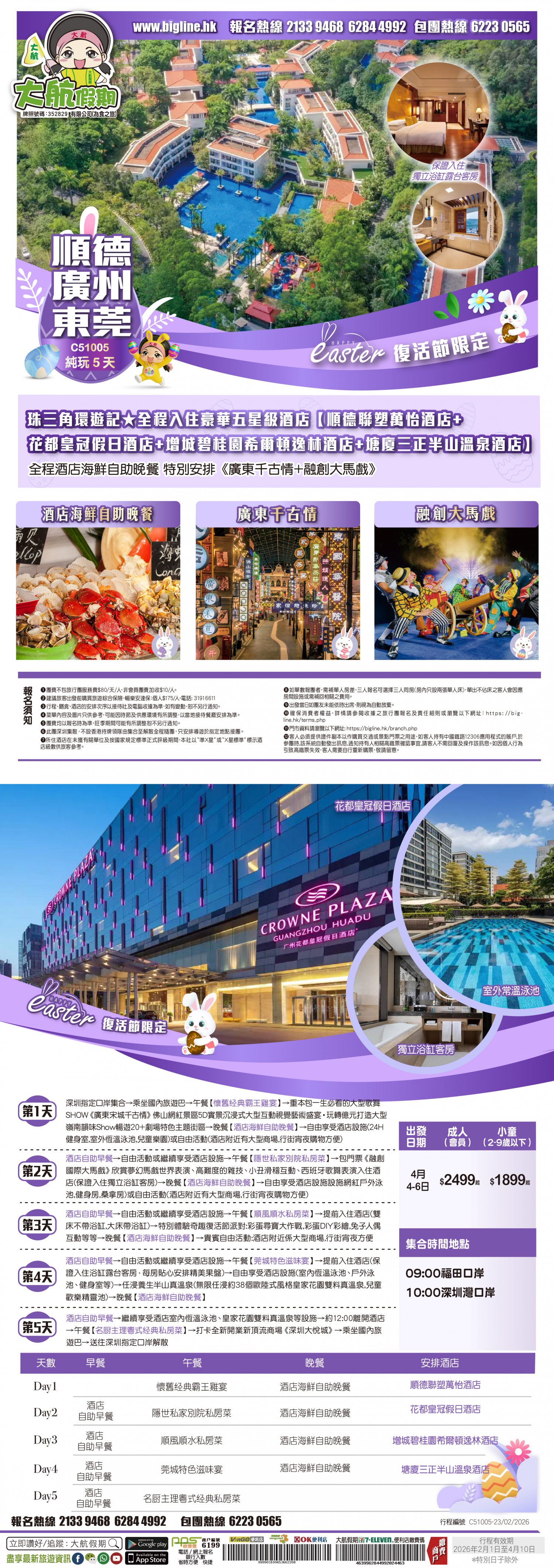 *團員繳付退票費後 (如適用): 1) 已繳款項可保留半年; 或 2) 選擇轉團後, 餘款則保留半年; 或 3) 可繳付『迫不得已理由』之手續費後, 取回已付餘款。 *個別機票+酒店套票產品如因『迫不得已理由』取消外遊行程, 處理旅客退款時亦按以上訂列收取每位退票費及手續費, 並以行程表 (套票單張) 所列為準。 責任細則: 1. 本公司保留合併團隊出發的權利。 2. 行程書或單張內所列費用根據當時機票價格及國際貨幣兌換率而訂立。外幣浮動等情況之下, 本公司保留在出發前調整各項費用的權利及徵收額外費用。 3. 所有列出的交通服務資料只供參考, 如有更改概不負責, 一切須以出票時為準。 4. 除本公司直接提供之服務外, 本公司及其職員或附屬公司或與本公司有經營關係之公司代理人身份在香港或外地安排其他獨立機構所提供之交通工具 (如飛機、輪船、火車、或遊覽巴士等) 、住宿、膳食或娛樂觀光項目等 (“委託機構”), 團員如遇交通延誤、行李遺失、意外傷亡或財物損失等, 該依照當地法律向擁有、管理或操作之委託機構直接交涉或追討賠償, 通常該等機構均各訂位不同條例, 以對客人負責。在此情況下, 本公司概不對該等損失或傷亡負責。 5. 除因由本公司之員工或其他直接管理或操作之機構之疏忽而引致團員之個人傷亡外, 本公司對團員在任何意外中之個人傷亡、經濟、娛樂或精神損失概不負責。 6. 除經本公司同意及安排, 如團員自行更改由其他人士代為參團, 本公司或其委託機構之職員有權取消其隨團之資格, 而無須發還任何團費, 而該人士在隨團期間之保險、責任賠償、行為後果等均由該人仕自行承擔。 7. 如因天氣、罷工、戰爭、怠工或安全情況影響而引致有關交通工具暫停服務, 停航或其他事故, 而必須將行程更改或取消部份行程, 本公司則將團員所繳交之費用扣除因以上事故而引致之損失後, 退回差額給團員。 8. 有關住宿、膳食、遊覽節目等問題, 均依據行程表安排, 行程先後次序有可能需要更改, 一切以當地安排為準。若遇特殊情況, 如簽證受阻, 當地酒店突告客滿或航機改變飛行時間或地點, 以及非本公司或其委託機構所能控制之因素, 令旅行團節目有增減, 或臨時更改交通工具、班機時間、機種及更換酒店等等, 本公司或其委託機構得依當時情況全權盡力處理, 團員不得藉故反對或退出, 因故取消之節目, 將不獲退還款項, 任何因延期而引致之額外支出, 本公司或其委託機構概不負責。 9. 所有酒店及住宿根據行程安排, 本公司視乎當時情形作出更改, 但不限於遇展覽會或特殊情況下, 將住宿鄰近城市之同等級酒店及住宿代替。本公司如因『迫不得已理由(外遊)』(即指戰爭、政治動盪、恐怖襲擊、天災、疫症、惡劣天氣、交通工具發生技術問題、載運機構臨時更改班次或取消服務、罷工、工業行動、旅遊目的地政府或世界衛生組織發出旅遊警示(警告)、香港特別行政區政府發出紅色或黑色外遊警示、不可抗力事件,以及業界不能控制的其他不利離開香港或在香港境外旅遊的情況)於外遊旅行團出發後更改任何項目而引致成本增加,可向顧客徵收額外費用。 10. 【已成團】代表該團號之指定出發日期預訂機位或已有足夠人數報名參加。但出發與否還受其他因素影響, 本公司保留最終決定權。 11. 任何團員在參與各項活動時, 如經常不遵守服飾人員之指引或安排, 在行動或言語上侮辱或滋擾其他團員或工作人員, 本公司或其委託機構職員有權視具體情況而取消其隨團資格而母須發任何團費, 而受該旅客監護之18歲以下同行團員亦須一併離開, 有關旅客離團後一切活動, 概與本公司或其委託機構無關。 12. 團員如欲於旅程完畢後延期返港, 須於出發前十四天提出, 以便本公司代為預定返港機位, 延期返港之機位, 未能即時作實, 團員不得藉此理由要求退出, 旅程完畢後延期逗留之費用, 概由團員自負。 13. 延期返港之團友, 必須在離境前七十二小時向航空公司確實回程機位, 任何機位如有變更, 概與本公司無關。 14. 團員如在旅途中自行離團或放棄行程, 離團後之責任自負, 一切後果與本公司或其委託機構無關。 15. 參團者須切實遵守各國及各地法例, 包括但不限於防疫防控條例, 並嚴禁攜帶違例物品出入境, 並照實申報攜帶之物品及現金。 16. 任何種類的簽證審批權及出入境批准權一律由該國或地區之領事館及/或出入境部門全權決定, 出入境如有問題, 責任旅客自負, 本公司或其委託機構母須負任何責任。如簽證已代辦, 簽證費恕不退還。 17. 即使團員持有效之入境簽證及旅遊證件, 而於入境時被當值之移民局海關人員拒絕入境, 本公司或其委託機構亦無須負任何責任。所需額外安排之食宿、交通費用、全部由其本人負責, 其餘下的行程亦將不會獲得任何補償, 亦不得要求退款或改團。 18. 中國內地相關法規規定, 即日起旅客入住中國內地境內酒店時, 公安機關會透過酒店前台向旅客一併採集人像信息資訊。 19. 如出現一些非本公司能力範圍可控制之問題 (如花卉、紅葉提早凋謝或景觀、自然現象、景點活動或戶外項目) 會受天氣等因素影響, 如未能安排則取消不作任何退款安排。 20. 旅客如在旅程中確診 COVID-19或其他傳染病,無論受到當地政府隔離或其他檢疫要求影響與否,為確保其他旅客之安全,確診旅