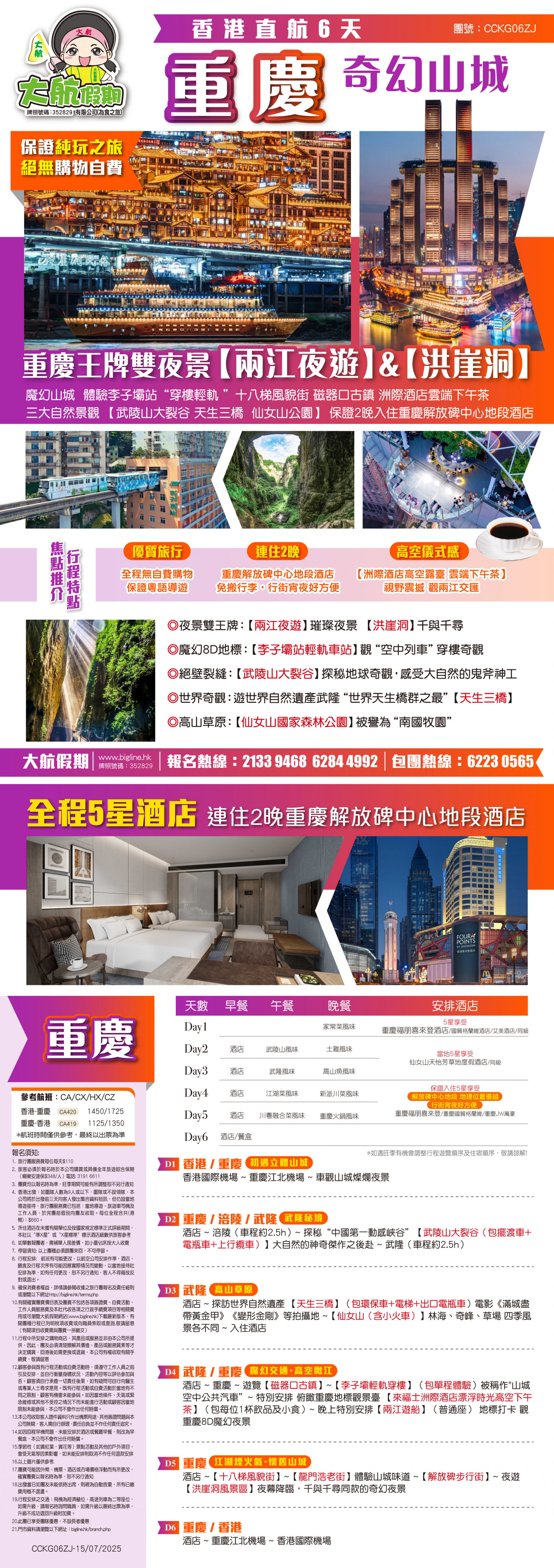 *團員繳付退票費後 (如適用): 1) 已繳款項可保留半年; 或 2) 選擇轉團後, 餘款則保留半年; 或 3) 可繳付『迫不得已理由』之手續費後, 取回已付餘款。 *個別機票+酒店套票產品如因『迫不得已理由』取消外遊行程, 處理旅客退款時亦按以上訂列收取每位退票費及手續費, 並以行程表 (套票單張) 所列為準。 責任細則: 1. 本公司保留合併團隊出發的權利。 2. 行程書或單張內所列費用根據當時機票價格及國際貨幣兌換率而訂立。外幣浮動等情況之下, 本公司保留在出發前調整各項費用的權利及徵收額外費用。 3. 所有列出的交通服務資料只供參考, 如有更改概不負責, 一切須以出票時為準。 4. 除本公司直接提供之服務外, 本公司及其職員或附屬公司或與本公司有經營關係之公司代理人身份在香港或外地安排其他獨立機構所提供之交通工具 (如飛機、輪船、火車、或遊覽巴士等) 、住宿、膳食或娛樂觀光項目等 (“委託機構”), 團員如遇交通延誤、行李遺失、意外傷亡或財物損失等, 該依照當地法律向擁有、管理或操作之委託機構直接交涉或追討賠償, 通常該等機構均各訂位不同條例, 以對客人負責。在此情況下, 本公司概不對該等損失或傷亡負責。 5. 除因由本公司之員工或其他直接管理或操作之機構之疏忽而引致團員之個人傷亡外, 本公司對團員在任何意外中之個人傷亡、經濟、娛樂或精神損失概不負責。 6. 除經本公司同意及安排, 如團員自行更改由其他人士代為參團, 本公司或其委託機構之職員有權取消其隨團之資格, 而無須發還任何團費, 而該人士在隨團期間之保險、責任賠償、行為後果等均由該人仕自行承擔。 7. 如因天氣、罷工、戰爭、怠工或安全情況影響而引致有關交通工具暫停服務, 停航或其他事故, 而必須將行程更改或取消部份行程, 本公司則將團員所繳交之費用扣除因以上事故而引致之損失後, 退回差額給團員。 8. 有關住宿、膳食、遊覽節目等問題, 均依據行程表安排, 行程先後次序有可能需要更改, 一切以當地安排為準。若遇特殊情況, 如簽證受阻, 當地酒店突告客滿或航機改變飛行時間或地點, 以及非本公司或其委託機構所能控制之因素, 令旅行團節目有增減, 或臨時更改交通工具、班機時間、機種及更換酒店等等, 本公司或其委託機構得依當時情況全權盡力處理, 團員不得藉故反對或退出, 因故取消之節目, 將不獲退還款項, 任何因延期而引致之額外支出, 本公司或其委託機構概不負責。 9. 所有酒店及住宿根據行程安排, 本公司視乎當時情形作出更改, 但不限於遇展覽會或特殊情況下, 將住宿鄰近城市之同等級酒店及住宿代替。本公司如因『迫不得已理由(外遊)』(即指戰爭、政治動盪、恐怖襲擊、天災、疫症、惡劣天氣、交通工具發生技術問題、載運機構臨時更改班次或取消服務、罷工、工業行動、旅遊目的地政府或世界衛生組織發出旅遊警示(警告)、香港特別行政區政府發出紅色或黑色外遊警示、不可抗力事件,以及業界不能控制的其他不利離開香港或在香港境外旅遊的情況)於外遊旅行團出發後更改任何項目而引致成本增加,可向顧客徵收額外費用。 10. 【已成團】代表該團號之指定出發日期預訂機位或已有足夠人數報名參加。但出發與否還受其他因素影響, 本公司保留最終決定權。 11. 任何團員在參與各項活動時, 如經常不遵守服飾人員之指引或安排, 在行動或言語上侮辱或滋擾其他團員或工作人員, 本公司或其委託機構職員有權視具體情況而取消其隨團資格而母須發任何團費, 而受該旅客監護之18歲以下同行團員亦須一併離開, 有關旅客離團後一切活動, 概與本公司或其委託機構無關。 12. 團員如欲於旅程完畢後延期返港, 須於出發前十四天提出, 以便本公司代為預定返港機位, 延期返港之機位, 未能即時作實, 團員不得藉此理由要求退出, 旅程完畢後延期逗留之費用, 概由團員自負。 13. 延期返港之團友, 必須在離境前七十二小時向航空公司確實回程機位, 任何機位如有變更, 概與本公司無關。 14. 團員如在旅途中自行離團或放棄行程, 離團後之責任自負, 一切後果與本公司或其委託機構無關。 15. 參團者須切實遵守各國及各地法例, 包括但不限於防疫防控條例, 並嚴禁攜帶違例物品出入境, 並照實申報攜帶之物品及現金。 16. 任何種類的簽證審批權及出入境批准權一律由該國或地區之領事館及/或出入境部門全權決定, 出入境如有問題, 責任旅客自負, 本公司或其委託機構母須負任何責任。如簽證已代辦, 簽證費恕不退還。 17. 即使團員持有效之入境簽證及旅遊證件, 而於入境時被當值之移民局海關人員拒絕入境, 本公司或其委託機構亦無須負任何責任。所需額外安排之食宿、交通費用、全部由其本人負責, 其餘下的行程亦將不會獲得任何補償, 亦不得要求退款或改團。 18. 中國內地相關法規規定, 即日起旅客入住中國內地境內酒店時, 公安機關會透過酒店前台向旅客一併採集人像信息資訊。 19. 如出現一些非本公司能力範圍可控制之問題 (如花卉、紅葉提早凋謝或景觀、自然現象、景點活動或戶外項目) 會受天氣等因素影響, 如未能安排則取消不作任何退款安排。 20. 旅客如在旅程中確診 COVID-19或其他傳染病,無論受到當地政府隔離或其他檢疫要求影響與否,為確保其他旅客之安全,確診旅