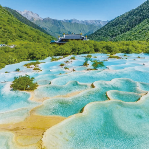 酒店~成都站 特別安排大航貴賓VIP禮遇:專人陪同引導、專人搬運行李至車廂、優先上車通道)~搭乘川青鐵路至九寨段*(有機會使用松潘站/黃龍九寨站/黃勝關站,敬請請意)~人間瑤池【黃龍景區】(重本包門票+上下纜車+山頂接駁車)~九寨溝