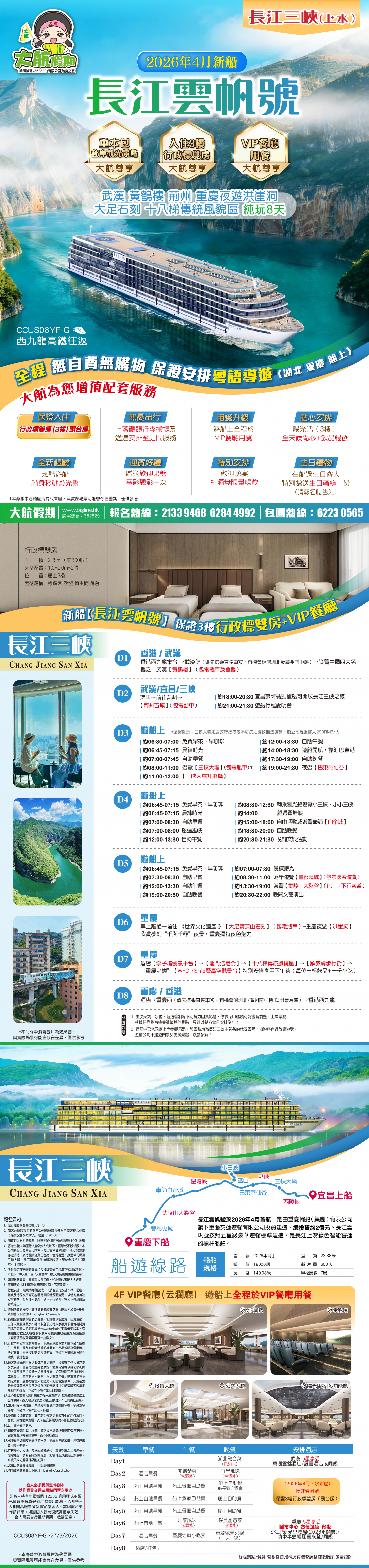 *團員繳付退票費後 (如適用): 1) 已繳款項可保留半年; 或 2) 選擇轉團後, 餘款則保留半年; 或 3) 可繳付『迫不得已理由』之手續費後, 取回已付餘款。 *個別機票+酒店套票產品如因『迫不得已理由』取消外遊行程, 處理旅客退款時亦按以上訂列收取每位退票費及手續費, 並以行程表 (套票單張) 所列為準。 責任細則: 1. 本公司保留合併團隊出發的權利。 2. 行程書或單張內所列費用根據當時機票價格及國際貨幣兌換率而訂立。外幣浮動等情況之下, 本公司保留在出發前調整各項費用的權利及徵收額外費用。 3. 所有列出的交通服務資料只供參考, 如有更改概不負責, 一切須以出票時為準。 4. 除本公司直接提供之服務外, 本公司及其職員或附屬公司或與本公司有經營關係之公司代理人身份在香港或外地安排其他獨立機構所提供之交通工具 (如飛機、輪船、火車、或遊覽巴士等) 、住宿、膳食或娛樂觀光項目等 (“委託機構”), 團員如遇交通延誤、行李遺失、意外傷亡或財物損失等, 該依照當地法律向擁有、管理或操作之委託機構直接交涉或追討賠償, 通常該等機構均各訂位不同條例, 以對客人負責。在此情況下, 本公司概不對該等損失或傷亡負責。 5. 除因由本公司之員工或其他直接管理或操作之機構之疏忽而引致團員之個人傷亡外, 本公司對團員在任何意外中之個人傷亡、經濟、娛樂或精神損失概不負責。 6. 除經本公司同意及安排, 如團員自行更改由其他人士代為參團, 本公司或其委託機構之職員有權取消其隨團之資格, 而無須發還任何團費, 而該人士在隨團期間之保險、責任賠償、行為後果等均由該人仕自行承擔。 7. 如因天氣、罷工、戰爭、怠工或安全情況影響而引致有關交通工具暫停服務, 停航或其他事故, 而必須將行程更改或取消部份行程, 本公司則將團員所繳交之費用扣除因以上事故而引致之損失後, 退回差額給團員。 8. 有關住宿、膳食、遊覽節目等問題, 均依據行程表安排, 行程先後次序有可能需要更改, 一切以當地安排為準。若遇特殊情況, 如簽證受阻, 當地酒店突告客滿或航機改變飛行時間或地點, 以及非本公司或其委託機構所能控制之因素, 令旅行團節目有增減, 或臨時更改交通工具、班機時間、機種及更換酒店等等, 本公司或其委託機構得依當時情況全權盡力處理, 團員不得藉故反對或退出, 因故取消之節目, 將不獲退還款項, 任何因延期而引致之額外支出, 本公司或其委託機構概不負責。 9. 所有酒店及住宿根據行程安排, 本公司視乎當時情形作出更改, 但不限於遇展覽會或特殊情況下, 將住宿鄰近城市之同等級酒店及住宿代替。本公司如因『迫不得已理由(外遊)』(即指戰爭、政治動盪、恐怖襲擊、天災、疫症、惡劣天氣、交通工具發生技術問題、載運機構臨時更改班次或取消服務、罷工、工業行動、旅遊目的地政府或世界衛生組織發出旅遊警示(警告)、香港特別行政區政府發出紅色或黑色外遊警示、不可抗力事件,以及業界不能控制的其他不利離開香港或在香港境外旅遊的情況)於外遊旅行團出發後更改任何項目而引致成本增加,可向顧客徵收額外費用。 10. 【已成團】代表該團號之指定出發日期預訂機位或已有足夠人數報名參加。但出發與否還受其他因素影響, 本公司保留最終決定權。 11. 任何團員在參與各項活動時, 如經常不遵守服飾人員之指引或安排, 在行動或言語上侮辱或滋擾其他團員或工作人員, 本公司或其委託機構職員有權視具體情況而取消其隨團資格而母須發任何團費, 而受該旅客監護之18歲以下同行團員亦須一併離開, 有關旅客離團後一切活動, 概與本公司或其委託機構無關。 12. 團員如欲於旅程完畢後延期返港, 須於出發前十四天提出, 以便本公司代為預定返港機位, 延期返港之機位, 未能即時作實, 團員不得藉此理由要求退出, 旅程完畢後延期逗留之費用, 概由團員自負。 13. 延期返港之團友, 必須在離境前七十二小時向航空公司確實回程機位, 任何機位如有變更, 概與本公司無關。 14. 團員如在旅途中自行離團或放棄行程, 離團後之責任自負, 一切後果與本公司或其委託機構無關。 15. 參團者須切實遵守各國及各地法例, 包括但不限於防疫防控條例, 並嚴禁攜帶違例物品出入境, 並照實申報攜帶之物品及現金。 16. 任何種類的簽證審批權及出入境批准權一律由該國或地區之領事館及/或出入境部門全權決定, 出入境如有問題, 責任旅客自負, 本公司或其委託機構母須負任何責任。如簽證已代辦, 簽證費恕不退還。 17. 即使團員持有效之入境簽證及旅遊證件, 而於入境時被當值之移民局海關人員拒絕入境, 本公司或其委託機構亦無須負任何責任。所需額外安排之食宿、交通費用、全部由其本人負責, 其餘下的行程亦將不會獲得任何補償, 亦不得要求退款或改團。 18. 中國內地相關法規規定, 即日起旅客入住中國內地境內酒店時, 公安機關會透過酒店前台向旅客一併採集人像信息資訊。 19. 如出現一些非本公司能力範圍可控制之問題 (如花卉、紅葉提早凋謝或景觀、自然現象、景點活動或戶外項目) 會受天氣等因素影響, 如未能安排則取消不作任何退款安排。 20. 旅客如在旅程中確診 COVID-19或其他傳染病,無論受到當地政府隔離或其他檢疫要求影響與否,為確保其他旅客之安全,確診旅