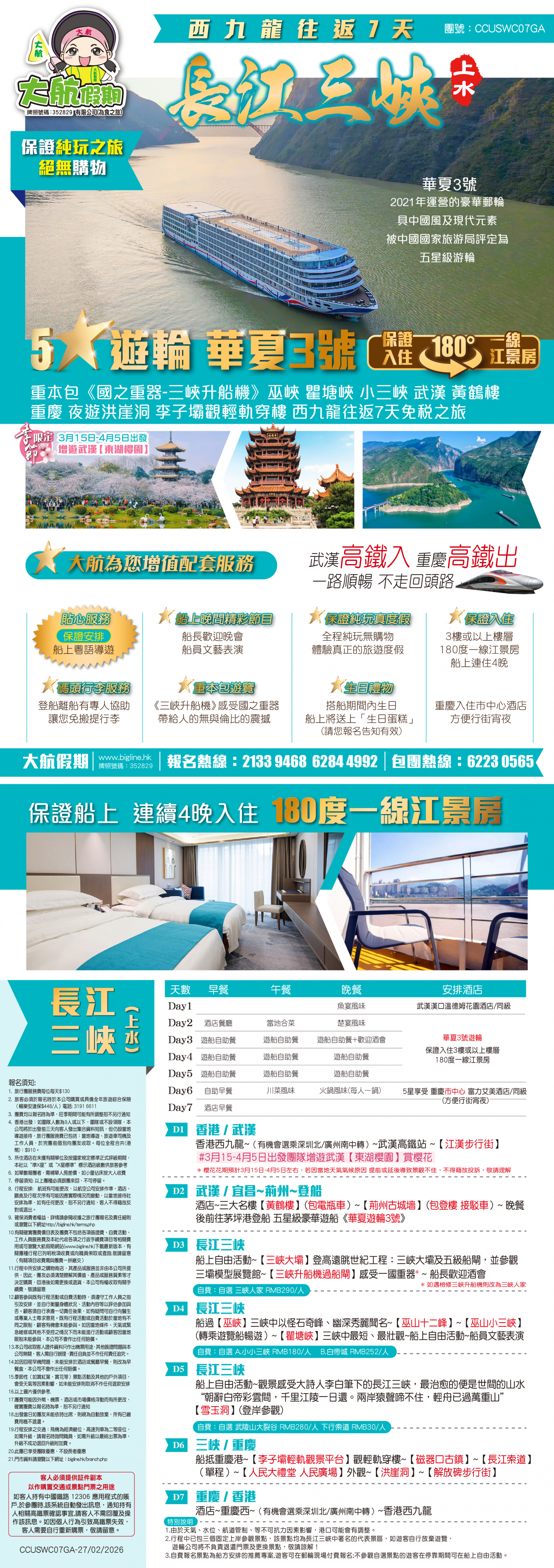 *團員繳付退票費後 (如適用): 1) 已繳款項可保留半年; 或 2) 選擇轉團後, 餘款則保留半年; 或 3) 可繳付『迫不得已理由』之手續費後, 取回已付餘款。 *個別機票+酒店套票產品如因『迫不得已理由』取消外遊行程, 處理旅客退款時亦按以上訂列收取每位退票費及手續費, 並以行程表 (套票單張) 所列為準。 責任細則: 1. 本公司保留合併團隊出發的權利。 2. 行程書或單張內所列費用根據當時機票價格及國際貨幣兌換率而訂立。外幣浮動等情況之下, 本公司保留在出發前調整各項費用的權利及徵收額外費用。 3. 所有列出的交通服務資料只供參考, 如有更改概不負責, 一切須以出票時為準。 4. 除本公司直接提供之服務外, 本公司及其職員或附屬公司或與本公司有經營關係之公司代理人身份在香港或外地安排其他獨立機構所提供之交通工具 (如飛機、輪船、火車、或遊覽巴士等) 、住宿、膳食或娛樂觀光項目等 (“委託機構”), 團員如遇交通延誤、行李遺失、意外傷亡或財物損失等, 該依照當地法律向擁有、管理或操作之委託機構直接交涉或追討賠償, 通常該等機構均各訂位不同條例, 以對客人負責。在此情況下, 本公司概不對該等損失或傷亡負責。 5. 除因由本公司之員工或其他直接管理或操作之機構之疏忽而引致團員之個人傷亡外, 本公司對團員在任何意外中之個人傷亡、經濟、娛樂或精神損失概不負責。 6. 除經本公司同意及安排, 如團員自行更改由其他人士代為參團, 本公司或其委託機構之職員有權取消其隨團之資格, 而無須發還任何團費, 而該人士在隨團期間之保險、責任賠償、行為後果等均由該人仕自行承擔。 7. 如因天氣、罷工、戰爭、怠工或安全情況影響而引致有關交通工具暫停服務, 停航或其他事故, 而必須將行程更改或取消部份行程, 本公司則將團員所繳交之費用扣除因以上事故而引致之損失後, 退回差額給團員。 8. 有關住宿、膳食、遊覽節目等問題, 均依據行程表安排, 行程先後次序有可能需要更改, 一切以當地安排為準。若遇特殊情況, 如簽證受阻, 當地酒店突告客滿或航機改變飛行時間或地點, 以及非本公司或其委託機構所能控制之因素, 令旅行團節目有增減, 或臨時更改交通工具、班機時間、機種及更換酒店等等, 本公司或其委託機構得依當時情況全權盡力處理, 團員不得藉故反對或退出, 因故取消之節目, 將不獲退還款項, 任何因延期而引致之額外支出, 本公司或其委託機構概不負責。 9. 所有酒店及住宿根據行程安排, 本公司視乎當時情形作出更改, 但不限於遇展覽會或特殊情況下, 將住宿鄰近城市之同等級酒店及住宿代替。本公司如因『迫不得已理由(外遊)』(即指戰爭、政治動盪、恐怖襲擊、天災、疫症、惡劣天氣、交通工具發生技術問題、載運機構臨時更改班次或取消服務、罷工、工業行動、旅遊目的地政府或世界衛生組織發出旅遊警示(警告)、香港特別行政區政府發出紅色或黑色外遊警示、不可抗力事件,以及業界不能控制的其他不利離開香港或在香港境外旅遊的情況)於外遊旅行團出發後更改任何項目而引致成本增加,可向顧客徵收額外費用。 10. 【已成團】代表該團號之指定出發日期預訂機位或已有足夠人數報名參加。但出發與否還受其他因素影響, 本公司保留最終決定權。 11. 任何團員在參與各項活動時, 如經常不遵守服飾人員之指引或安排, 在行動或言語上侮辱或滋擾其他團員或工作人員, 本公司或其委託機構職員有權視具體情況而取消其隨團資格而母須發任何團費, 而受該旅客監護之18歲以下同行團員亦須一併離開, 有關旅客離團後一切活動, 概與本公司或其委託機構無關。 12. 團員如欲於旅程完畢後延期返港, 須於出發前十四天提出, 以便本公司代為預定返港機位, 延期返港之機位, 未能即時作實, 團員不得藉此理由要求退出, 旅程完畢後延期逗留之費用, 概由團員自負。 13. 延期返港之團友, 必須在離境前七十二小時向航空公司確實回程機位, 任何機位如有變更, 概與本公司無關。 14. 團員如在旅途中自行離團或放棄行程, 離團後之責任自負, 一切後果與本公司或其委託機構無關。 15. 參團者須切實遵守各國及各地法例, 包括但不限於防疫防控條例, 並嚴禁攜帶違例物品出入境, 並照實申報攜帶之物品及現金。 16. 任何種類的簽證審批權及出入境批准權一律由該國或地區之領事館及/或出入境部門全權決定, 出入境如有問題, 責任旅客自負, 本公司或其委託機構母須負任何責任。如簽證已代辦, 簽證費恕不退還。 17. 即使團員持有效之入境簽證及旅遊證件, 而於入境時被當值之移民局海關人員拒絕入境, 本公司或其委託機構亦無須負任何責任。所需額外安排之食宿、交通費用、全部由其本人負責, 其餘下的行程亦將不會獲得任何補償, 亦不得要求退款或改團。 18. 中國內地相關法規規定, 即日起旅客入住中國內地境內酒店時, 公安機關會透過酒店前台向旅客一併採集人像信息資訊。 19. 如出現一些非本公司能力範圍可控制之問題 (如花卉、紅葉提早凋謝或景觀、自然現象、景點活動或戶外項目) 會受天氣等因素影響, 如未能安排則取消不作任何退款安排。 20. 旅客如在旅程中確診 COVID-19或其他傳染病,無論受到當地政府隔離或其他檢疫要求影響與否,為確保其他旅客之安全,確診旅
