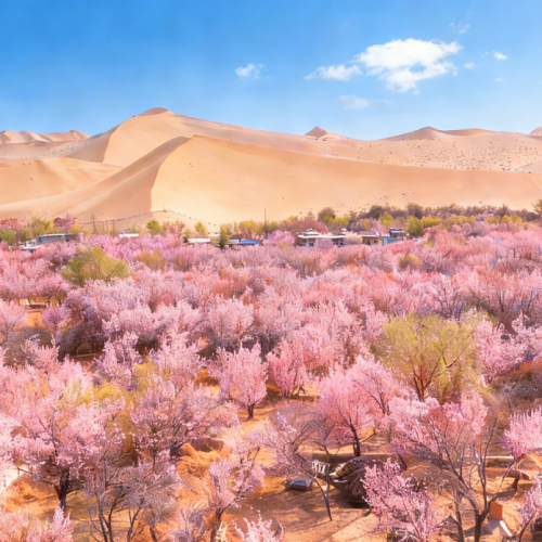 .酒店--(車程約1.5小時)「托克遜南湖杏花村」欣賞南疆盆地中率先綻放的杏花海,捕捉早春的盎然生機--(車程約4小時)沿途將觀賞從吐魯番的綠洲花海,過渡到南疆門戶的沙漠邊緣城 抵達塔里木河畔尉犁入住