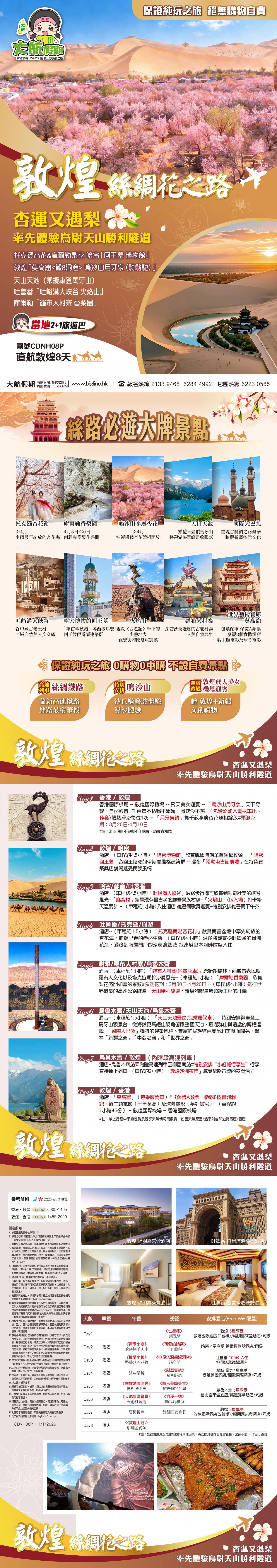直航敦煌#絲綢花之路 杏運又遇梨 率先體驗烏尉天山勝利隧道 托克遜杏花&庫爾勒梨花 哈密「回王墓 博物館」天山天池(乘纜車登馬牙山) 吐魯番「吐峪溝大峽谷」庫爾勒「羅布人村寨 」2+1旅遊巴 8天