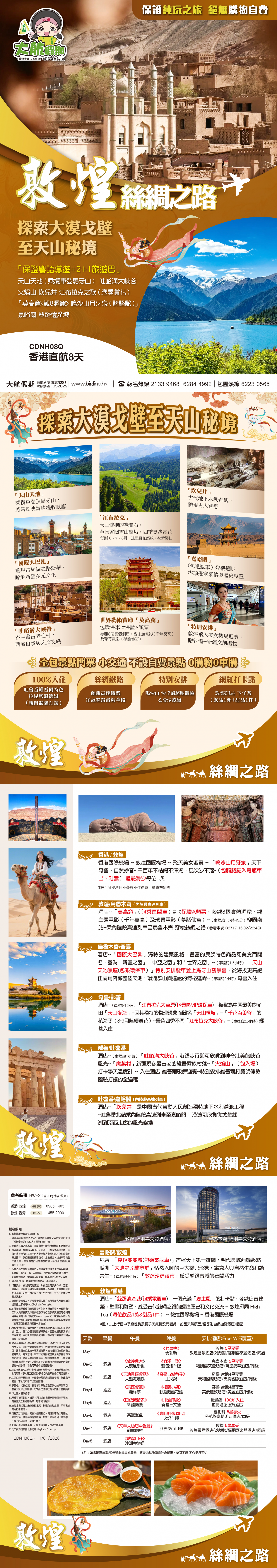 .酒店--「絲路遺產城(包乘電瓶車)」一個充滿「廢土風」的打卡點,參觀仿古建築、壁畫和雕塑,感受古代絲綢之路的輝煌歷史和文化交流 -- 敦煌印局 High Tea(每位飲品1款&甜品1件) -- 敦煌國際機場 -- 香港國際機場
