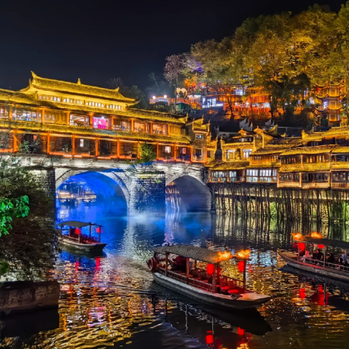 酒店→鳳凰古城【沈從文故居】→【萬壽宮】 非物質文化遺產【民俗街】【包乘特色小船遊沱江】→東門城樓 虹橋藝術樓→鳳凰古城站→搭乘高鐵→香港西九龍(參考車次:G6079 1614/2159)