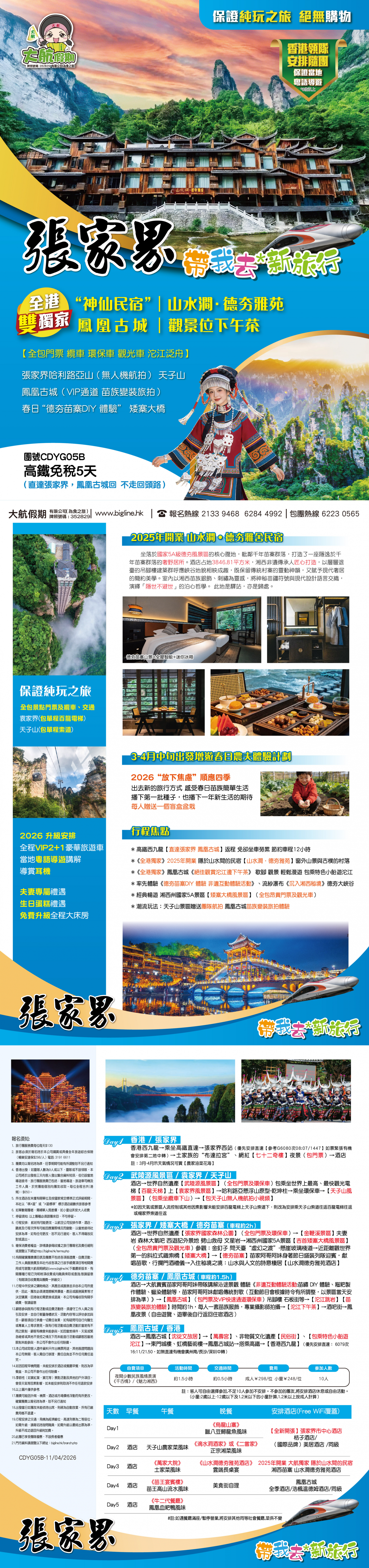 《西九直達張家界*鳳凰返》 #粵語導遊#2026推出「全港雙獨家」《“神仙民宿”山水澗·德夯雅苑 古城觀景位下午茶》張家界森林公園 鳳凰古城<VIP通道 苗族變裝旅拍>德夯苗寨 免稅纯玩5天