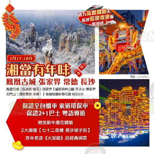 酒店→【鳳凰古城】(含環保車及門票)→包乘【特色小船漫遊沱江】→【非遺一條街】→ 世界自然遺產【張家界國家森林公園】(全包門票及環保車)→【金鞭溪景區】夫妻巖→夜遊網紅打卡點【七十二奇樓燈會】觀看土家文藝表演,參與新年狂歡舞會→親自體驗燃放新年煙花