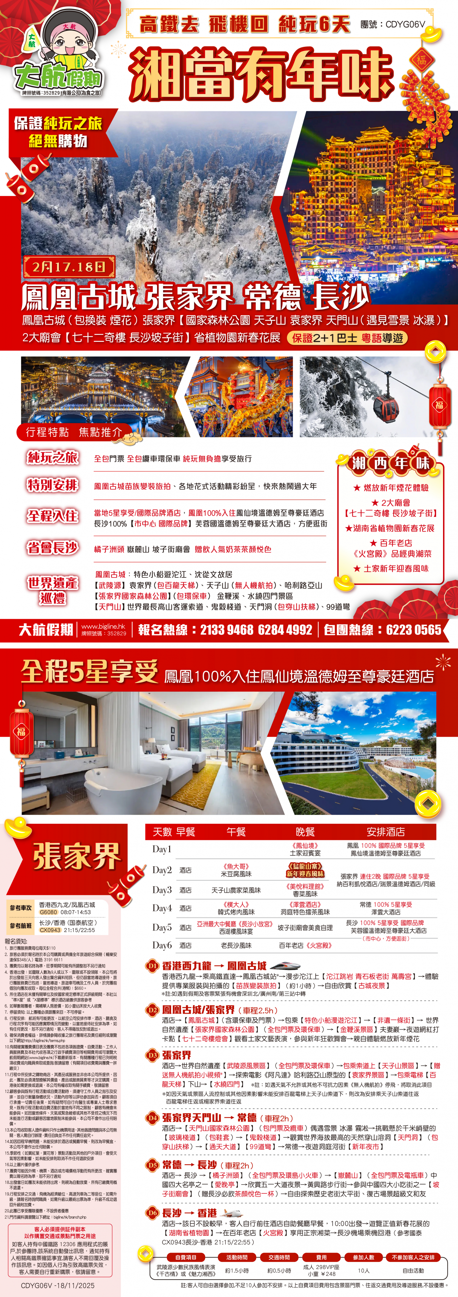 *團員繳付退票費後 (如適用): 1) 已繳款項可保留半年; 或 2) 選擇轉團後, 餘款則保留半年; 或 3) 可繳付『迫不得已理由』之手續費後, 取回已付餘款。 *個別機票+酒店套票產品如因『迫不得已理由』取消外遊行程, 處理旅客退款時亦按以上訂列收取每位退票費及手續費, 並以行程表 (套票單張) 所列為準。 責任細則: 1. 本公司保留合併團隊出發的權利。 2. 行程書或單張內所列費用根據當時機票價格及國際貨幣兌換率而訂立。外幣浮動等情況之下, 本公司保留在出發前調整各項費用的權利及徵收額外費用。 3. 所有列出的交通服務資料只供參考, 如有更改概不負責, 一切須以出票時為準。 4. 除本公司直接提供之服務外, 本公司及其職員或附屬公司或與本公司有經營關係之公司代理人身份在香港或外地安排其他獨立機構所提供之交通工具 (如飛機、輪船、火車、或遊覽巴士等) 、住宿、膳食或娛樂觀光項目等 (“委託機構”), 團員如遇交通延誤、行李遺失、意外傷亡或財物損失等, 該依照當地法律向擁有、管理或操作之委託機構直接交涉或追討賠償, 通常該等機構均各訂位不同條例, 以對客人負責。在此情況下, 本公司概不對該等損失或傷亡負責。 5. 除因由本公司之員工或其他直接管理或操作之機構之疏忽而引致團員之個人傷亡外, 本公司對團員在任何意外中之個人傷亡、經濟、娛樂或精神損失概不負責。 6. 除經本公司同意及安排, 如團員自行更改由其他人士代為參團, 本公司或其委託機構之職員有權取消其隨團之資格, 而無須發還任何團費, 而該人士在隨團期間之保險、責任賠償、行為後果等均由該人仕自行承擔。 7. 如因天氣、罷工、戰爭、怠工或安全情況影響而引致有關交通工具暫停服務, 停航或其他事故, 而必須將行程更改或取消部份行程, 本公司則將團員所繳交之費用扣除因以上事故而引致之損失後, 退回差額給團員。 8. 有關住宿、膳食、遊覽節目等問題, 均依據行程表安排, 行程先後次序有可能需要更改, 一切以當地安排為準。若遇特殊情況, 如簽證受阻, 當地酒店突告客滿或航機改變飛行時間或地點, 以及非本公司或其委託機構所能控制之因素, 令旅行團節目有增減, 或臨時更改交通工具、班機時間、機種及更換酒店等等, 本公司或其委託機構得依當時情況全權盡力處理, 團員不得藉故反對或退出, 因故取消之節目, 將不獲退還款項, 任何因延期而引致之額外支出, 本公司或其委託機構概不負責。 9. 所有酒店及住宿根據行程安排, 本公司視乎當時情形作出更改, 但不限於遇展覽會或特殊情況下, 將住宿鄰近城市之同等級酒店及住宿代替。本公司如因『迫不得已理由(外遊)』(即指戰爭、政治動盪、恐怖襲擊、天災、疫症、惡劣天氣、交通工具發生技術問題、載運機構臨時更改班次或取消服務、罷工、工業行動、旅遊目的地政府或世界衛生組織發出旅遊警示(警告)、香港特別行政區政府發出紅色或黑色外遊警示、不可抗力事件,以及業界不能控制的其他不利離開香港或在香港境外旅遊的情況)於外遊旅行團出發後更改任何項目而引致成本增加,可向顧客徵收額外費用。 10. 【已成團】代表該團號之指定出發日期預訂機位或已有足夠人數報名參加。但出發與否還受其他因素影響, 本公司保留最終決定權。 11. 任何團員在參與各項活動時, 如經常不遵守服飾人員之指引或安排, 在行動或言語上侮辱或滋擾其他團員或工作人員, 本公司或其委託機構職員有權視具體情況而取消其隨團資格而母須發任何團費, 而受該旅客監護之18歲以下同行團員亦須一併離開, 有關旅客離團後一切活動, 概與本公司或其委託機構無關。 12. 團員如欲於旅程完畢後延期返港, 須於出發前十四天提出, 以便本公司代為預定返港機位, 延期返港之機位, 未能即時作實, 團員不得藉此理由要求退出, 旅程完畢後延期逗留之費用, 概由團員自負。 13. 延期返港之團友, 必須在離境前七十二小時向航空公司確實回程機位, 任何機位如有變更, 概與本公司無關。 14. 團員如在旅途中自行離團或放棄行程, 離團後之責任自負, 一切後果與本公司或其委託機構無關。 15. 參團者須切實遵守各國及各地法例, 包括但不限於防疫防控條例, 並嚴禁攜帶違例物品出入境, 並照實申報攜帶之物品及現金。 16. 任何種類的簽證審批權及出入境批准權一律由該國或地區之領事館及/或出入境部門全權決定, 出入境如有問題, 責任旅客自負, 本公司或其委託機構母須負任何責任。如簽證已代辦, 簽證費恕不退還。 17. 即使團員持有效之入境簽證及旅遊證件, 而於入境時被當值之移民局海關人員拒絕入境, 本公司或其委託機構亦無須負任何責任。所需額外安排之食宿、交通費用、全部由其本人負責, 其餘下的行程亦將不會獲得任何補償, 亦不得要求退款或改團。 18. 中國內地相關法規規定, 即日起旅客入住中國內地境內酒店時, 公安機關會透過酒店前台向旅客一併採集人像信息資訊。 19. 如出現一些非本公司能力範圍可控制之問題 (如花卉、紅葉提早凋謝或景觀、自然現象、景點活動或戶外項目) 會受天氣等因素影響, 如未能安排則取消不作任何退款安排。 20. 旅客如在旅程中確診 COVID-19或其他傳染病,無論受到當地政府隔離或其他檢疫要求影響與否,為確保其他旅客之安全,確診旅