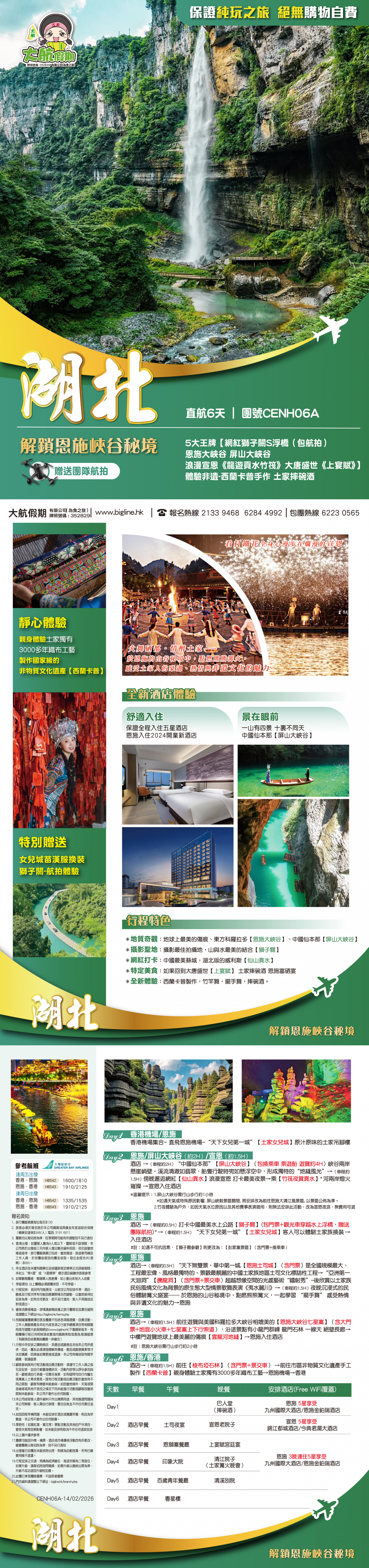 酒店→(車程約1.5H)前往【梭布埡石林】(含門票+景交車) →前往市區非物質文化遺產手工製作【西蘭卡普】親身體驗土家獨有3000多年織布工藝→恩施機場→香港
