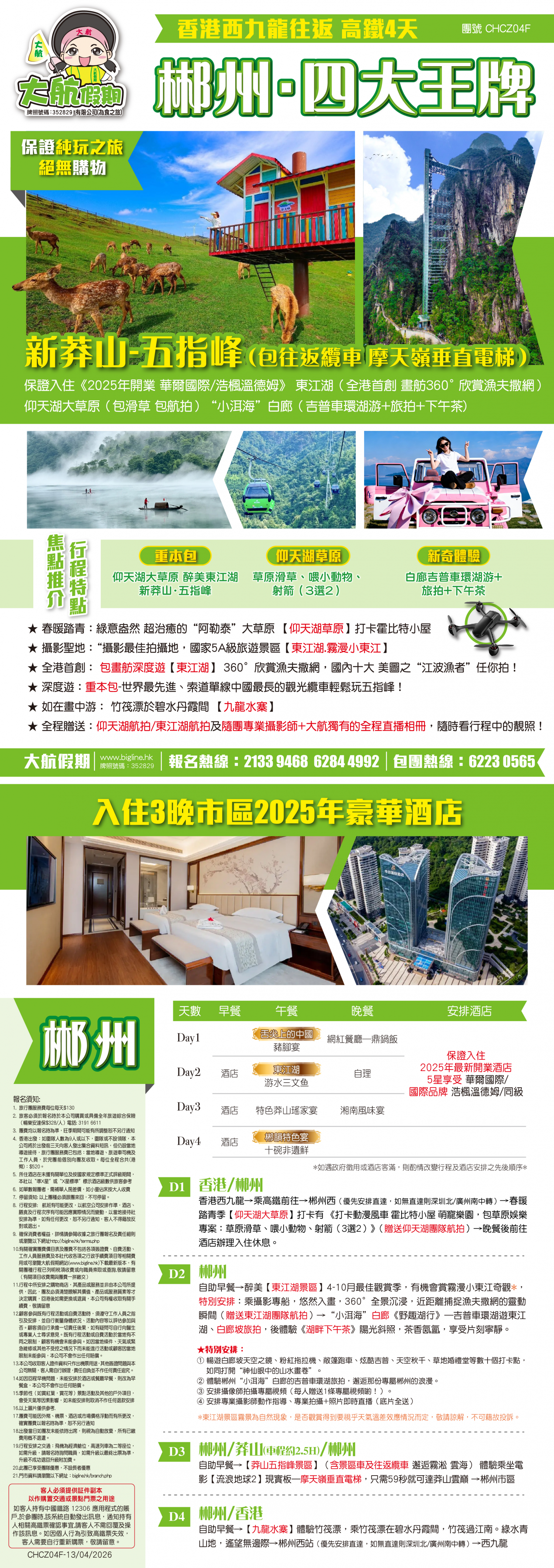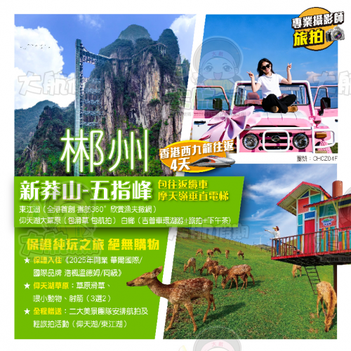 郴州 · 【新莽山-五指峰(包往返纜車 摩天嶺電梯)】 保證入住「2025開業 華爾國際/浩楓溫德姆」東江湖(畫舫360欣賞漁夫撒網) "小洱海"白廊吉普車環湖+旅拍+下午茶 高椅嶺 高鐵4天