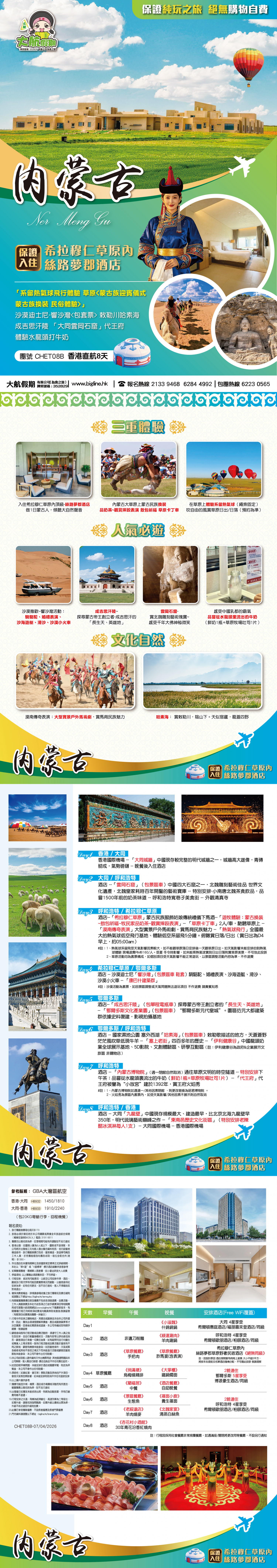 .酒店--「希拉穆仁草原」蒙古民族服飾姑娘傳統禮儀下馬酒--「遊牧體驗:蒙古換裝~敖包祈福~牧民家品奶茶~觀賞摔跤表演」-- 「草原卡丁車」2人/車,馳騁草原上 -- 「漠南傳奇表演」大型實景戶外馬術劇,賞馬背民族魅力 -- 「熱氣球飛行」全國最大的熱氣球低空飛行基地、體驗低空系留飛5分鐘。俯瞰賞日落/日出(賞日出為D4早上,約05:00am)