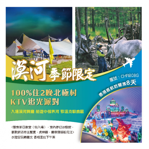 .酒店--「室內冰雕藝術館」(包禦寒大衣)--乘搭內陸航班前往神州最北 漠河--「鄂溫克馴鹿園」零距離撫摸、投餵馴鹿--露營帳篷靜待追蹤北極光(水果&小食&果乾&每位啤酒/支+飲料/瓶) 漠河是中國唯一觀測北極光之地