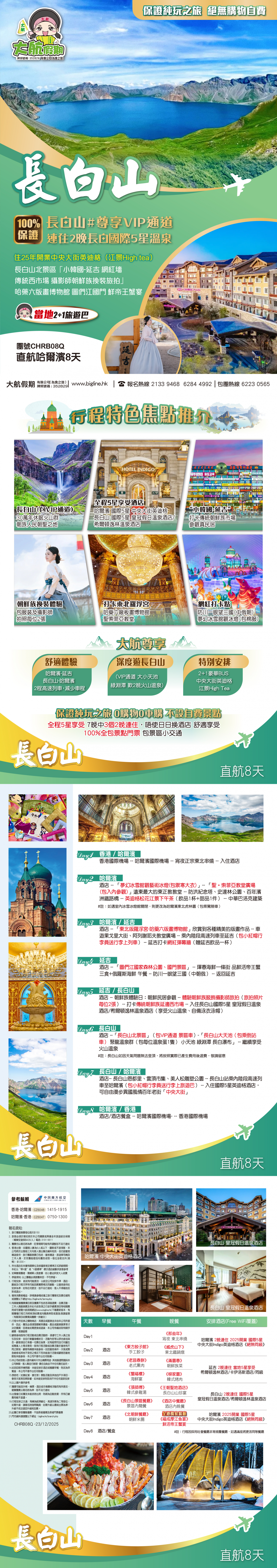 .酒店-- 長白山恩都里、雲頂市集、美人松雕塑公園 -- 長白山站乘內陸段高速列車至哈爾濱(包小紅帽行李員送行李上旅遊巴) -- 入住國際5星英迪格酒店,可自由漫步異國風情百年老街「中央大街」