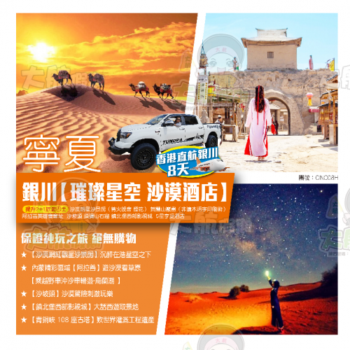 【純玩。寧夏】銀川 提升2+1巴士 騰格里沙漠【觀星沙景房】 越野車穿越烏蘭湖 (航拍) 阿拉善英雄會會址 賀蘭山岩畫 須彌山石窟 鎮北堡西部影視城直航8天