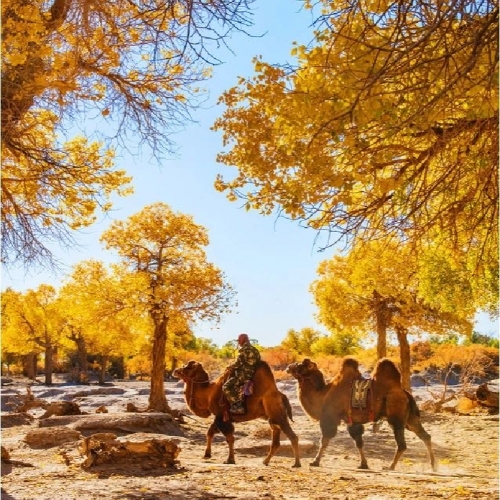 打卡二道橋(倒影林) 拍攝水映金胡楊,四道橋(英雄林) 《英雄》取景地的壯闊胡楊林海,七道橋(夢境林) 捕捉晨露下的鮮亮黃葉,最後前往八道橋(沙海王國)欣賞大漠日落→住額濟納旗