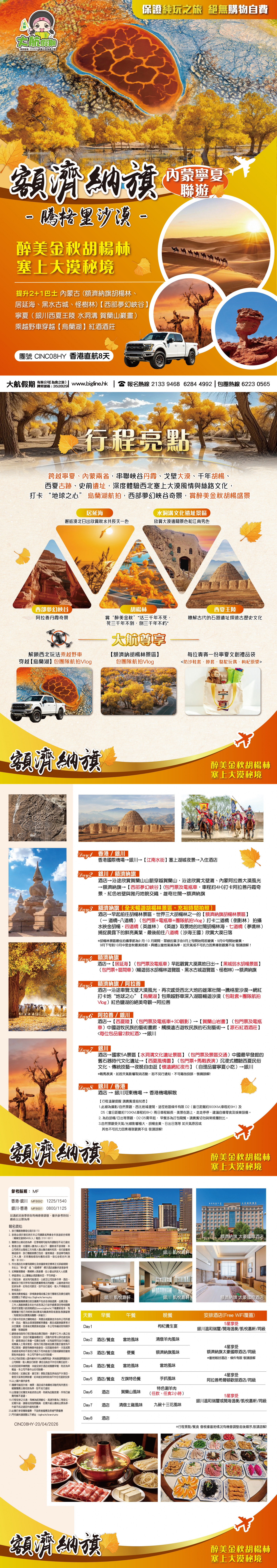 2.前往額濟納旗途徑地區條件有限, 為拍胡楊/居延海日出等景觀,D2-D5需早起, 早餐多為打包簡餐。請貴賓切勿與常團對比。