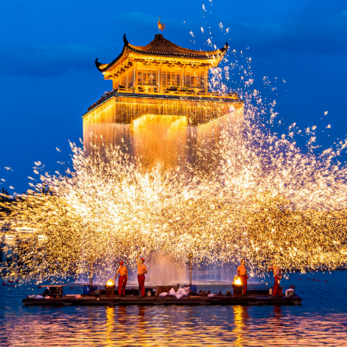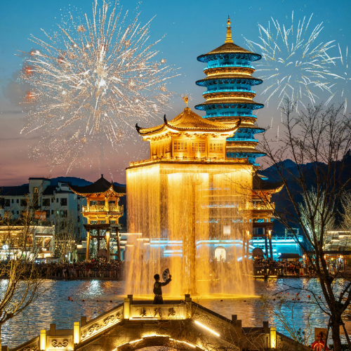 酒店~一座千年歷史【瑤里古鎮】江西安徽邊界的明珠,人文與生態化徽派小鄉~【徽州不夜城·婺女洲】觀賞震撼火焰美學演出:水上打鐵花、火爐、火刀、火流星、篝火狂歡等,金閣水幕燈光秀