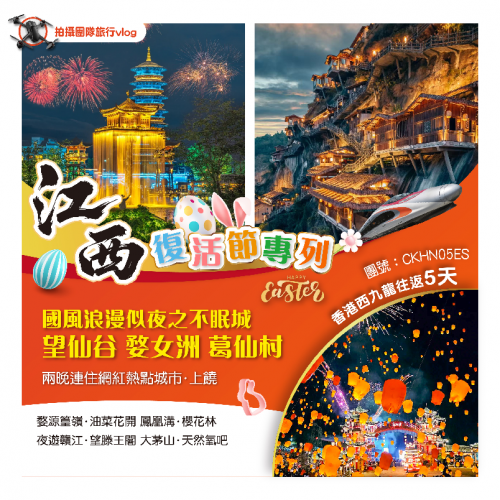 酒店~【鳳凰溝·櫻花盛開】*(包景區小交通)漫山遍野的春天花色,粉櫻、鬱金香等~南昌高鐵站~(搭乘大航高鐵專列)~香港西九龍站散團