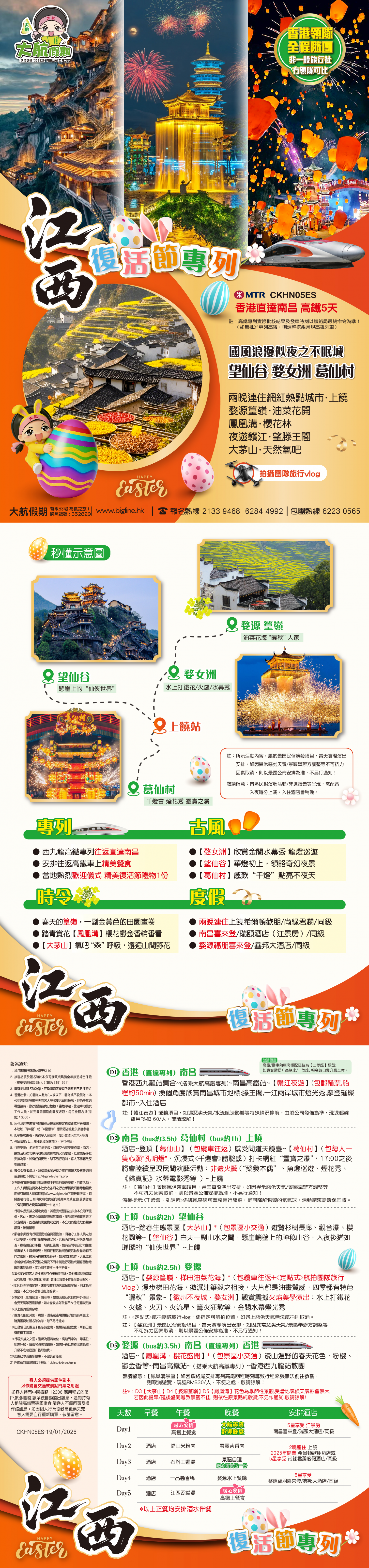 *團員繳付退票費後 (如適用): 1) 已繳款項可保留半年; 或 2) 選擇轉團後, 餘款則保留半年; 或 3) 可繳付『迫不得已理由』之手續費後, 取回已付餘款。 *個別機票+酒店套票產品如因『迫不得已理由』取消外遊行程, 處理旅客退款時亦按以上訂列收取每位退票費及手續費, 並以行程表 (套票單張) 所列為準。 責任細則: 1. 本公司保留合併團隊出發的權利。 2. 行程書或單張內所列費用根據當時機票價格及國際貨幣兌換率而訂立。外幣浮動等情況之下, 本公司保留在出發前調整各項費用的權利及徵收額外費用。 3. 所有列出的交通服務資料只供參考, 如有更改概不負責, 一切須以出票時為準。 4. 除本公司直接提供之服務外, 本公司及其職員或附屬公司或與本公司有經營關係之公司代理人身份在香港或外地安排其他獨立機構所提供之交通工具 (如飛機、輪船、火車、或遊覽巴士等) 、住宿、膳食或娛樂觀光項目等 (“委託機構”), 團員如遇交通延誤、行李遺失、意外傷亡或財物損失等, 該依照當地法律向擁有、管理或操作之委託機構直接交涉或追討賠償, 通常該等機構均各訂位不同條例, 以對客人負責。在此情況下, 本公司概不對該等損失或傷亡負責。 5. 除因由本公司之員工或其他直接管理或操作之機構之疏忽而引致團員之個人傷亡外, 本公司對團員在任何意外中之個人傷亡、經濟、娛樂或精神損失概不負責。 6. 除經本公司同意及安排, 如團員自行更改由其他人士代為參團, 本公司或其委託機構之職員有權取消其隨團之資格, 而無須發還任何團費, 而該人士在隨團期間之保險、責任賠償、行為後果等均由該人仕自行承擔。 7. 如因天氣、罷工、戰爭、怠工或安全情況影響而引致有關交通工具暫停服務, 停航或其他事故, 而必須將行程更改或取消部份行程, 本公司則將團員所繳交之費用扣除因以上事故而引致之損失後, 退回差額給團員。 8. 有關住宿、膳食、遊覽節目等問題, 均依據行程表安排, 行程先後次序有可能需要更改, 一切以當地安排為準。若遇特殊情況, 如簽證受阻, 當地酒店突告客滿或航機改變飛行時間或地點, 以及非本公司或其委託機構所能控制之因素, 令旅行團節目有增減, 或臨時更改交通工具、班機時間、機種及更換酒店等等, 本公司或其委託機構得依當時情況全權盡力處理, 團員不得藉故反對或退出, 因故取消之節目, 將不獲退還款項, 任何因延期而引致之額外支出, 本公司或其委託機構概不負責。 9. 所有酒店及住宿根據行程安排, 本公司視乎當時情形作出更改, 但不限於遇展覽會或特殊情況下, 將住宿鄰近城市之同等級酒店及住宿代替。本公司如因『迫不得已理由(外遊)』(即指戰爭、政治動盪、恐怖襲擊、天災、疫症、惡劣天氣、交通工具發生技術問題、載運機構臨時更改班次或取消服務、罷工、工業行動、旅遊目的地政府或世界衛生組織發出旅遊警示(警告)、香港特別行政區政府發出紅色或黑色外遊警示、不可抗力事件,以及業界不能控制的其他不利離開香港或在香港境外旅遊的情況)於外遊旅行團出發後更改任何項目而引致成本增加,可向顧客徵收額外費用。 10. 【已成團】代表該團號之指定出發日期預訂機位或已有足夠人數報名參加。但出發與否還受其他因素影響, 本公司保留最終決定權。 11. 任何團員在參與各項活動時, 如經常不遵守服飾人員之指引或安排, 在行動或言語上侮辱或滋擾其他團員或工作人員, 本公司或其委託機構職員有權視具體情況而取消其隨團資格而母須發任何團費, 而受該旅客監護之18歲以下同行團員亦須一併離開, 有關旅客離團後一切活動, 概與本公司或其委託機構無關。 12. 團員如欲於旅程完畢後延期返港, 須於出發前十四天提出, 以便本公司代為預定返港機位, 延期返港之機位, 未能即時作實, 團員不得藉此理由要求退出, 旅程完畢後延期逗留之費用, 概由團員自負。 13. 延期返港之團友, 必須在離境前七十二小時向航空公司確實回程機位, 任何機位如有變更, 概與本公司無關。 14. 團員如在旅途中自行離團或放棄行程, 離團後之責任自負, 一切後果與本公司或其委託機構無關。 15. 參團者須切實遵守各國及各地法例, 包括但不限於防疫防控條例, 並嚴禁攜帶違例物品出入境, 並照實申報攜帶之物品及現金。 16. 任何種類的簽證審批權及出入境批准權一律由該國或地區之領事館及/或出入境部門全權決定, 出入境如有問題, 責任旅客自負, 本公司或其委託機構母須負任何責任。如簽證已代辦, 簽證費恕不退還。 17. 即使團員持有效之入境簽證及旅遊證件, 而於入境時被當值之移民局海關人員拒絕入境, 本公司或其委託機構亦無須負任何責任。所需額外安排之食宿、交通費用、全部由其本人負責, 其餘下的行程亦將不會獲得任何補償, 亦不得要求退款或改團。 18. 中國內地相關法規規定, 即日起旅客入住中國內地境內酒店時, 公安機關會透過酒店前台向旅客一併採集人像信息資訊。 19. 如出現一些非本公司能力範圍可控制之問題 (如花卉、紅葉提早凋謝或景觀、自然現象、景點活動或戶外項目) 會受天氣等因素影響, 如未能安排則取消不作任何退款安排。 20. 旅客如在旅程中確診 COVID-19或其他傳染病,無論受到當地政府隔離或其他檢疫要求影響與否,為確保其他旅客之安全,確診旅