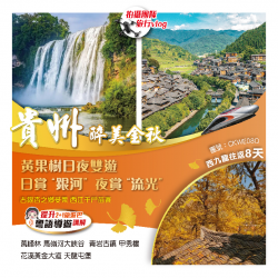 【金秋貴州】(保證2+1旅遊巴+粵語導遊)日夜雙遊黃果樹 世界古銀杏之鄉【妥樂】西江千戶苗寨<苗服換裝&團隊航拍vlog>【萬峰林·歎稻田下午茶】馬嶺河大峽谷 青岩古鎮 甲秀樓 高鐵8天