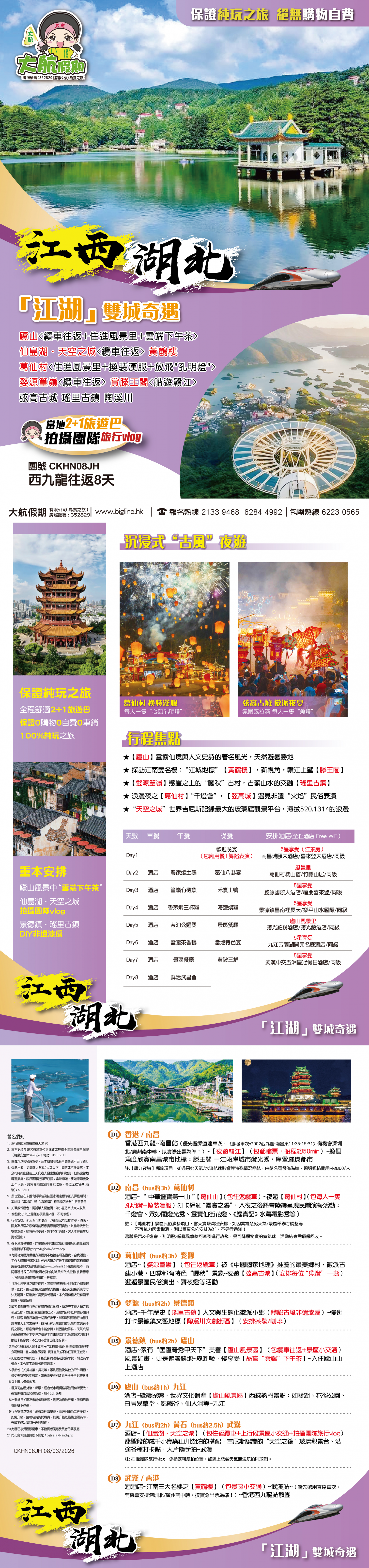 *團員繳付退票費後 (如適用): 1) 已繳款項可保留半年; 或 2) 選擇轉團後, 餘款則保留半年; 或 3) 可繳付『迫不得已理由』之手續費後, 取回已付餘款。 *個別機票+酒店套票產品如因『迫不得已理由』取消外遊行程, 處理旅客退款時亦按以上訂列收取每位退票費及手續費, 並以行程表 (套票單張) 所列為準。 責任細則: 1. 本公司保留合併團隊出發的權利。 2. 行程書或單張內所列費用根據當時機票價格及國際貨幣兌換率而訂立。外幣浮動等情況之下, 本公司保留在出發前調整各項費用的權利及徵收額外費用。 3. 所有列出的交通服務資料只供參考, 如有更改概不負責, 一切須以出票時為準。 4. 除本公司直接提供之服務外, 本公司及其職員或附屬公司或與本公司有經營關係之公司代理人身份在香港或外地安排其他獨立機構所提供之交通工具 (如飛機、輪船、火車、或遊覽巴士等) 、住宿、膳食或娛樂觀光項目等 (“委託機構”), 團員如遇交通延誤、行李遺失、意外傷亡或財物損失等, 該依照當地法律向擁有、管理或操作之委託機構直接交涉或追討賠償, 通常該等機構均各訂位不同條例, 以對客人負責。在此情況下, 本公司概不對該等損失或傷亡負責。 5. 除因由本公司之員工或其他直接管理或操作之機構之疏忽而引致團員之個人傷亡外, 本公司對團員在任何意外中之個人傷亡、經濟、娛樂或精神損失概不負責。 6. 除經本公司同意及安排, 如團員自行更改由其他人士代為參團, 本公司或其委託機構之職員有權取消其隨團之資格, 而無須發還任何團費, 而該人士在隨團期間之保險、責任賠償、行為後果等均由該人仕自行承擔。 7. 如因天氣、罷工、戰爭、怠工或安全情況影響而引致有關交通工具暫停服務, 停航或其他事故, 而必須將行程更改或取消部份行程, 本公司則將團員所繳交之費用扣除因以上事故而引致之損失後, 退回差額給團員。 8. 有關住宿、膳食、遊覽節目等問題, 均依據行程表安排, 行程先後次序有可能需要更改, 一切以當地安排為準。若遇特殊情況, 如簽證受阻, 當地酒店突告客滿或航機改變飛行時間或地點, 以及非本公司或其委託機構所能控制之因素, 令旅行團節目有增減, 或臨時更改交通工具、班機時間、機種及更換酒店等等, 本公司或其委託機構得依當時情況全權盡力處理, 團員不得藉故反對或退出, 因故取消之節目, 將不獲退還款項, 任何因延期而引致之額外支出, 本公司或其委託機構概不負責。 9. 所有酒店及住宿根據行程安排, 本公司視乎當時情形作出更改, 但不限於遇展覽會或特殊情況下, 將住宿鄰近城市之同等級酒店及住宿代替。本公司如因『迫不得已理由(外遊)』(即指戰爭、政治動盪、恐怖襲擊、天災、疫症、惡劣天氣、交通工具發生技術問題、載運機構臨時更改班次或取消服務、罷工、工業行動、旅遊目的地政府或世界衛生組織發出旅遊警示(警告)、香港特別行政區政府發出紅色或黑色外遊警示、不可抗力事件,以及業界不能控制的其他不利離開香港或在香港境外旅遊的情況)於外遊旅行團出發後更改任何項目而引致成本增加,可向顧客徵收額外費用。 10. 【已成團】代表該團號之指定出發日期預訂機位或已有足夠人數報名參加。但出發與否還受其他因素影響, 本公司保留最終決定權。 11. 任何團員在參與各項活動時, 如經常不遵守服飾人員之指引或安排, 在行動或言語上侮辱或滋擾其他團員或工作人員, 本公司或其委託機構職員有權視具體情況而取消其隨團資格而母須發任何團費, 而受該旅客監護之18歲以下同行團員亦須一併離開, 有關旅客離團後一切活動, 概與本公司或其委託機構無關。 12. 團員如欲於旅程完畢後延期返港, 須於出發前十四天提出, 以便本公司代為預定返港機位, 延期返港之機位, 未能即時作實, 團員不得藉此理由要求退出, 旅程完畢後延期逗留之費用, 概由團員自負。 13. 延期返港之團友, 必須在離境前七十二小時向航空公司確實回程機位, 任何機位如有變更, 概與本公司無關。 14. 團員如在旅途中自行離團或放棄行程, 離團後之責任自負, 一切後果與本公司或其委託機構無關。 15. 參團者須切實遵守各國及各地法例, 包括但不限於防疫防控條例, 並嚴禁攜帶違例物品出入境, 並照實申報攜帶之物品及現金。 16. 任何種類的簽證審批權及出入境批准權一律由該國或地區之領事館及/或出入境部門全權決定, 出入境如有問題, 責任旅客自負, 本公司或其委託機構母須負任何責任。如簽證已代辦, 簽證費恕不退還。 17. 即使團員持有效之入境簽證及旅遊證件, 而於入境時被當值之移民局海關人員拒絕入境, 本公司或其委託機構亦無須負任何責任。所需額外安排之食宿、交通費用、全部由其本人負責, 其餘下的行程亦將不會獲得任何補償, 亦不得要求退款或改團。 18. 中國內地相關法規規定, 即日起旅客入住中國內地境內酒店時, 公安機關會透過酒店前台向旅客一併採集人像信息資訊。 19. 如出現一些非本公司能力範圍可控制之問題 (如花卉、紅葉提早凋謝或景觀、自然現象、景點活動或戶外項目) 會受天氣等因素影響, 如未能安排則取消不作任何退款安排。 20. 旅客如在旅程中確診 COVID-19或其他傳染病,無論受到當地政府隔離或其他檢疫要求影響與否,為確保其他旅客之安全,確診旅