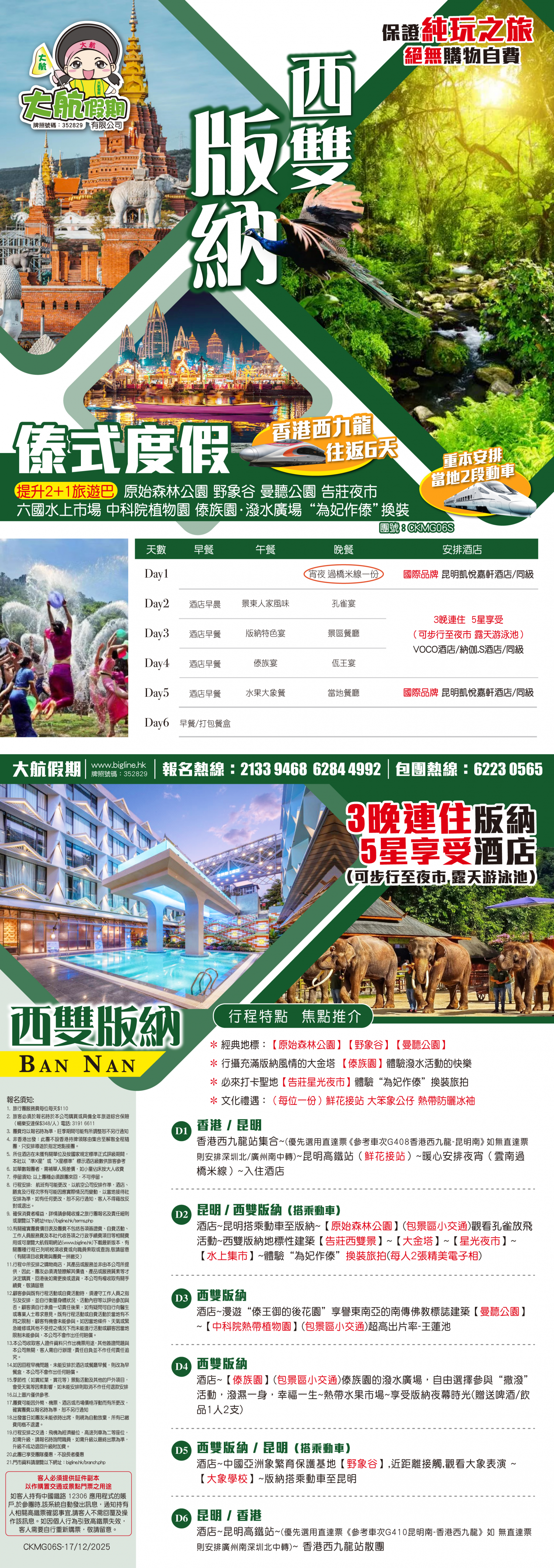 *團員繳付退票費後 (如適用): 1) 已繳款項可保留半年; 或 2) 選擇轉團後, 餘款則保留半年; 或 3) 可繳付『迫不得已理由』之手續費後, 取回已付餘款。 *個別機票+酒店套票產品如因『迫不得已理由』取消外遊行程, 處理旅客退款時亦按以上訂列收取每位退票費及手續費, 並以行程表 (套票單張) 所列為準。 責任細則: 1. 本公司保留合併團隊出發的權利。 2. 行程書或單張內所列費用根據當時機票價格及國際貨幣兌換率而訂立。外幣浮動等情況之下, 本公司保留在出發前調整各項費用的權利及徵收額外費用。 3. 所有列出的交通服務資料只供參考, 如有更改概不負責, 一切須以出票時為準。 4. 除本公司直接提供之服務外, 本公司及其職員或附屬公司或與本公司有經營關係之公司代理人身份在香港或外地安排其他獨立機構所提供之交通工具 (如飛機、輪船、火車、或遊覽巴士等) 、住宿、膳食或娛樂觀光項目等 (“委託機構”), 團員如遇交通延誤、行李遺失、意外傷亡或財物損失等, 該依照當地法律向擁有、管理或操作之委託機構直接交涉或追討賠償, 通常該等機構均各訂位不同條例, 以對客人負責。在此情況下, 本公司概不對該等損失或傷亡負責。 5. 除因由本公司之員工或其他直接管理或操作之機構之疏忽而引致團員之個人傷亡外, 本公司對團員在任何意外中之個人傷亡、經濟、娛樂或精神損失概不負責。 6. 除經本公司同意及安排, 如團員自行更改由其他人士代為參團, 本公司或其委託機構之職員有權取消其隨團之資格, 而無須發還任何團費, 而該人士在隨團期間之保險、責任賠償、行為後果等均由該人仕自行承擔。 7. 如因天氣、罷工、戰爭、怠工或安全情況影響而引致有關交通工具暫停服務, 停航或其他事故, 而必須將行程更改或取消部份行程, 本公司則將團員所繳交之費用扣除因以上事故而引致之損失後, 退回差額給團員。 8. 有關住宿、膳食、遊覽節目等問題, 均依據行程表安排, 行程先後次序有可能需要更改, 一切以當地安排為準。若遇特殊情況, 如簽證受阻, 當地酒店突告客滿或航機改變飛行時間或地點, 以及非本公司或其委託機構所能控制之因素, 令旅行團節目有增減, 或臨時更改交通工具、班機時間、機種及更換酒店等等, 本公司或其委託機構得依當時情況全權盡力處理, 團員不得藉故反對或退出, 因故取消之節目, 將不獲退還款項, 任何因延期而引致之額外支出, 本公司或其委託機構概不負責。 9. 所有酒店及住宿根據行程安排, 本公司視乎當時情形作出更改, 但不限於遇展覽會或特殊情況下, 將住宿鄰近城市之同等級酒店及住宿代替。本公司如因『迫不得已理由(外遊)』(即指戰爭、政治動盪、恐怖襲擊、天災、疫症、惡劣天氣、交通工具發生技術問題、載運機構臨時更改班次或取消服務、罷工、工業行動、旅遊目的地政府或世界衛生組織發出旅遊警示(警告)、香港特別行政區政府發出紅色或黑色外遊警示、不可抗力事件,以及業界不能控制的其他不利離開香港或在香港境外旅遊的情況)於外遊旅行團出發後更改任何項目而引致成本增加,可向顧客徵收額外費用。 10. 【已成團】代表該團號之指定出發日期預訂機位或已有足夠人數報名參加。但出發與否還受其他因素影響, 本公司保留最終決定權。 11. 任何團員在參與各項活動時, 如經常不遵守服飾人員之指引或安排, 在行動或言語上侮辱或滋擾其他團員或工作人員, 本公司或其委託機構職員有權視具體情況而取消其隨團資格而母須發任何團費, 而受該旅客監護之18歲以下同行團員亦須一併離開, 有關旅客離團後一切活動, 概與本公司或其委託機構無關。 12. 團員如欲於旅程完畢後延期返港, 須於出發前十四天提出, 以便本公司代為預定返港機位, 延期返港之機位, 未能即時作實, 團員不得藉此理由要求退出, 旅程完畢後延期逗留之費用, 概由團員自負。 13. 延期返港之團友, 必須在離境前七十二小時向航空公司確實回程機位, 任何機位如有變更, 概與本公司無關。 14. 團員如在旅途中自行離團或放棄行程, 離團後之責任自負, 一切後果與本公司或其委託機構無關。 15. 參團者須切實遵守各國及各地法例, 包括但不限於防疫防控條例, 並嚴禁攜帶違例物品出入境, 並照實申報攜帶之物品及現金。 16. 任何種類的簽證審批權及出入境批准權一律由該國或地區之領事館及/或出入境部門全權決定, 出入境如有問題, 責任旅客自負, 本公司或其委託機構母須負任何責任。如簽證已代辦, 簽證費恕不退還。 17. 即使團員持有效之入境簽證及旅遊證件, 而於入境時被當值之移民局海關人員拒絕入境, 本公司或其委託機構亦無須負任何責任。所需額外安排之食宿、交通費用、全部由其本人負責, 其餘下的行程亦將不會獲得任何補償, 亦不得要求退款或改團。 18. 中國內地相關法規規定, 即日起旅客入住中國內地境內酒店時, 公安機關會透過酒店前台向旅客一併採集人像信息資訊。 19. 如出現一些非本公司能力範圍可控制之問題 (如花卉、紅葉提早凋謝或景觀、自然現象、景點活動或戶外項目) 會受天氣等因素影響, 如未能安排則取消不作任何退款安排。 20. 旅客如在旅程中確診 COVID-19或其他傳染病,無論受到當地政府隔離或其他檢疫要求影響與否,為確保其他旅客之安全,確診旅