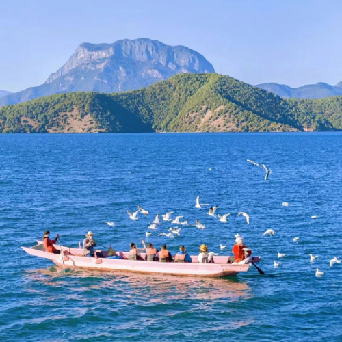 酒店~碼頭乘坐摩梭人獨特水上交通【豬槽船】(拍攝團隊旅行vlog)~登上【里務比島】遙望格姆女神山~自由選擇參與【摩梭族篝火晚會】~(視乎當日實際理想天氣狀態下) 觀賞瀘沽湖璀璨星空