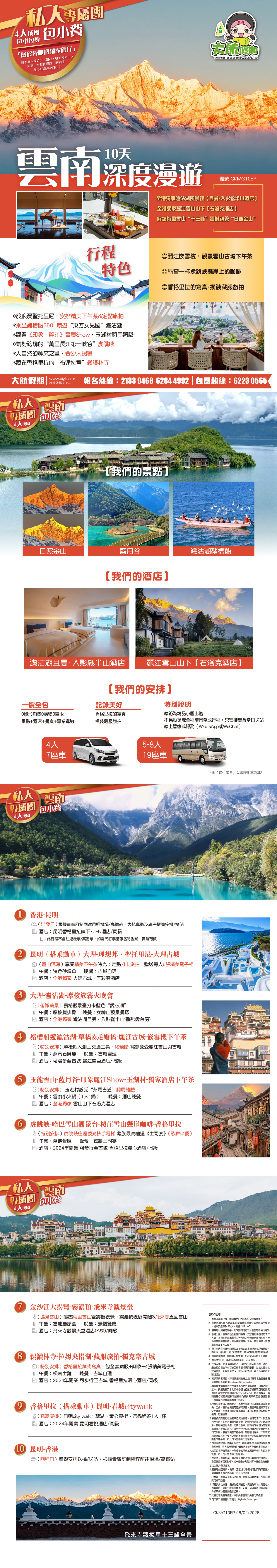 *團員繳付退票費後 (如適用): 1) 已繳款項可保留半年; 或 2) 選擇轉團後, 餘款則保留半年; 或 3) 可繳付『迫不得已理由』之手續費後, 取回已付餘款。 *個別機票+酒店套票產品如因『迫不得已理由』取消外遊行程, 處理旅客退款時亦按以上訂列收取每位退票費及手續費, 並以行程表 (套票單張) 所列為準。 責任細則: 1. 本公司保留合併團隊出發的權利。 2. 行程書或單張內所列費用根據當時機票價格及國際貨幣兌換率而訂立。外幣浮動等情況之下, 本公司保留在出發前調整各項費用的權利及徵收額外費用。 3. 所有列出的交通服務資料只供參考, 如有更改概不負責, 一切須以出票時為準。 4. 除本公司直接提供之服務外, 本公司及其職員或附屬公司或與本公司有經營關係之公司代理人身份在香港或外地安排其他獨立機構所提供之交通工具 (如飛機、輪船、火車、或遊覽巴士等) 、住宿、膳食或娛樂觀光項目等 (“委託機構”), 團員如遇交通延誤、行李遺失、意外傷亡或財物損失等, 該依照當地法律向擁有、管理或操作之委託機構直接交涉或追討賠償, 通常該等機構均各訂位不同條例, 以對客人負責。在此情況下, 本公司概不對該等損失或傷亡負責。 5. 除因由本公司之員工或其他直接管理或操作之機構之疏忽而引致團員之個人傷亡外, 本公司對團員在任何意外中之個人傷亡、經濟、娛樂或精神損失概不負責。 6. 除經本公司同意及安排, 如團員自行更改由其他人士代為參團, 本公司或其委託機構之職員有權取消其隨團之資格, 而無須發還任何團費, 而該人士在隨團期間之保險、責任賠償、行為後果等均由該人仕自行承擔。 7. 如因天氣、罷工、戰爭、怠工或安全情況影響而引致有關交通工具暫停服務, 停航或其他事故, 而必須將行程更改或取消部份行程, 本公司則將團員所繳交之費用扣除因以上事故而引致之損失後, 退回差額給團員。 8. 有關住宿、膳食、遊覽節目等問題, 均依據行程表安排, 行程先後次序有可能需要更改, 一切以當地安排為準。若遇特殊情況, 如簽證受阻, 當地酒店突告客滿或航機改變飛行時間或地點, 以及非本公司或其委託機構所能控制之因素, 令旅行團節目有增減, 或臨時更改交通工具、班機時間、機種及更換酒店等等, 本公司或其委託機構得依當時情況全權盡力處理, 團員不得藉故反對或退出, 因故取消之節目, 將不獲退還款項, 任何因延期而引致之額外支出, 本公司或其委託機構概不負責。 9. 所有酒店及住宿根據行程安排, 本公司視乎當時情形作出更改, 但不限於遇展覽會或特殊情況下, 將住宿鄰近城市之同等級酒店及住宿代替。本公司如因『迫不得已理由(外遊)』(即指戰爭、政治動盪、恐怖襲擊、天災、疫症、惡劣天氣、交通工具發生技術問題、載運機構臨時更改班次或取消服務、罷工、工業行動、旅遊目的地政府或世界衛生組織發出旅遊警示(警告)、香港特別行政區政府發出紅色或黑色外遊警示、不可抗力事件,以及業界不能控制的其他不利離開香港或在香港境外旅遊的情況)於外遊旅行團出發後更改任何項目而引致成本增加,可向顧客徵收額外費用。 10. 【已成團】代表該團號之指定出發日期預訂機位或已有足夠人數報名參加。但出發與否還受其他因素影響, 本公司保留最終決定權。 11. 任何團員在參與各項活動時, 如經常不遵守服飾人員之指引或安排, 在行動或言語上侮辱或滋擾其他團員或工作人員, 本公司或其委託機構職員有權視具體情況而取消其隨團資格而母須發任何團費, 而受該旅客監護之18歲以下同行團員亦須一併離開, 有關旅客離團後一切活動, 概與本公司或其委託機構無關。 12. 團員如欲於旅程完畢後延期返港, 須於出發前十四天提出, 以便本公司代為預定返港機位, 延期返港之機位, 未能即時作實, 團員不得藉此理由要求退出, 旅程完畢後延期逗留之費用, 概由團員自負。 13. 延期返港之團友, 必須在離境前七十二小時向航空公司確實回程機位, 任何機位如有變更, 概與本公司無關。 14. 團員如在旅途中自行離團或放棄行程, 離團後之責任自負, 一切後果與本公司或其委託機構無關。 15. 參團者須切實遵守各國及各地法例, 包括但不限於防疫防控條例, 並嚴禁攜帶違例物品出入境, 並照實申報攜帶之物品及現金。 16. 任何種類的簽證審批權及出入境批准權一律由該國或地區之領事館及/或出入境部門全權決定, 出入境如有問題, 責任旅客自負, 本公司或其委託機構母須負任何責任。如簽證已代辦, 簽證費恕不退還。 17. 即使團員持有效之入境簽證及旅遊證件, 而於入境時被當值之移民局海關人員拒絕入境, 本公司或其委託機構亦無須負任何責任。所需額外安排之食宿、交通費用、全部由其本人負責, 其餘下的行程亦將不會獲得任何補償, 亦不得要求退款或改團。 18. 中國內地相關法規規定, 即日起旅客入住中國內地境內酒店時, 公安機關會透過酒店前台向旅客一併採集人像信息資訊。 19. 如出現一些非本公司能力範圍可控制之問題 (如花卉、紅葉提早凋謝或景觀、自然現象、景點活動或戶外項目) 會受天氣等因素影響, 如未能安排則取消不作任何退款安排。 20. 旅客如在旅程中確診 COVID-19或其他傳染病,無論受到當地政府隔離或其他檢疫要求影響與否,為確保其他旅客之安全,確診旅