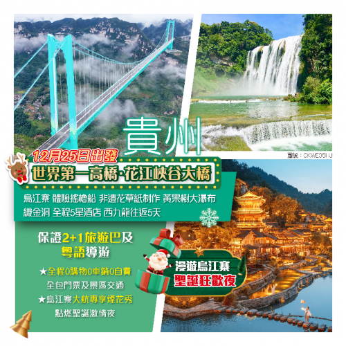 聖誕節#香港桂林高鐵專列【大航專場 香格里拉「LiveBand & 歌舞show」豐富自助晚宴】陽朔"天空之城"如意峰 船遊(世外桃源) 冠岩(小火車) 古東瀑布紅楓林 象鼻山 西街 高鐵4天